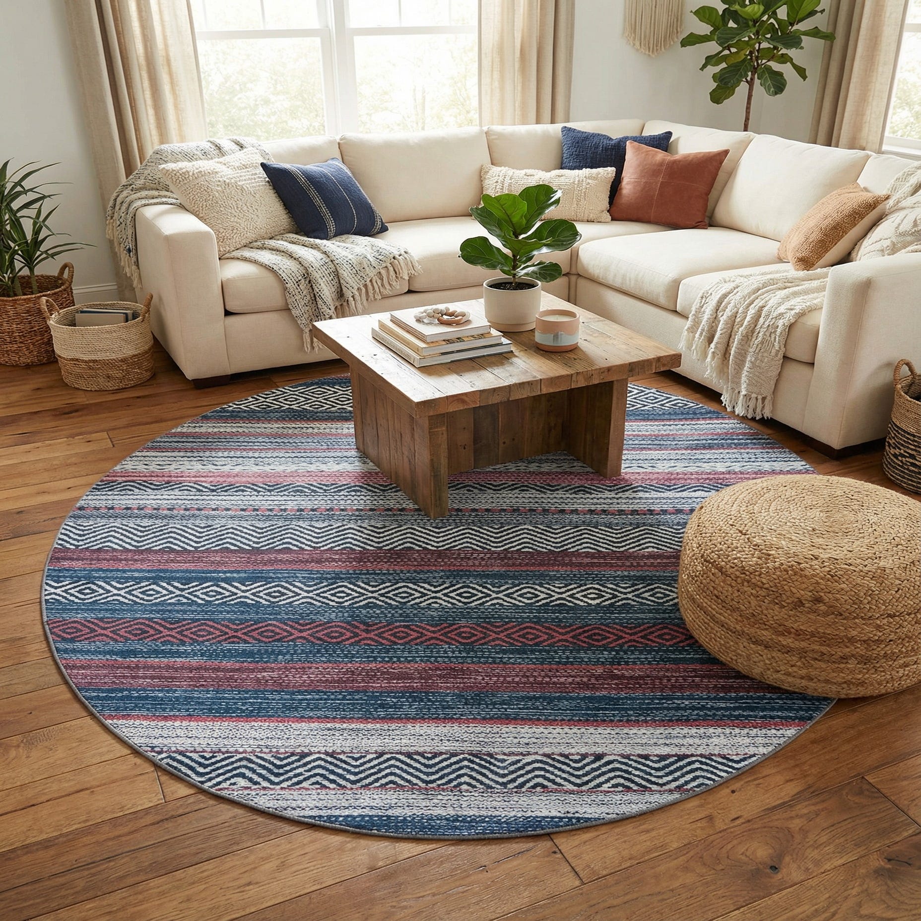 A banded, geometric weave set against a deep navy blue ground gives this round rug a lively, collected look. Narrow stripes alternate with repeating diamonds, chevrons and small woven motifs in shades of blue and light blue, accented by ivory, red, pink and puce. The horizontal patterning creates a sense of motion while the varied motifs add textural interest across the surface.