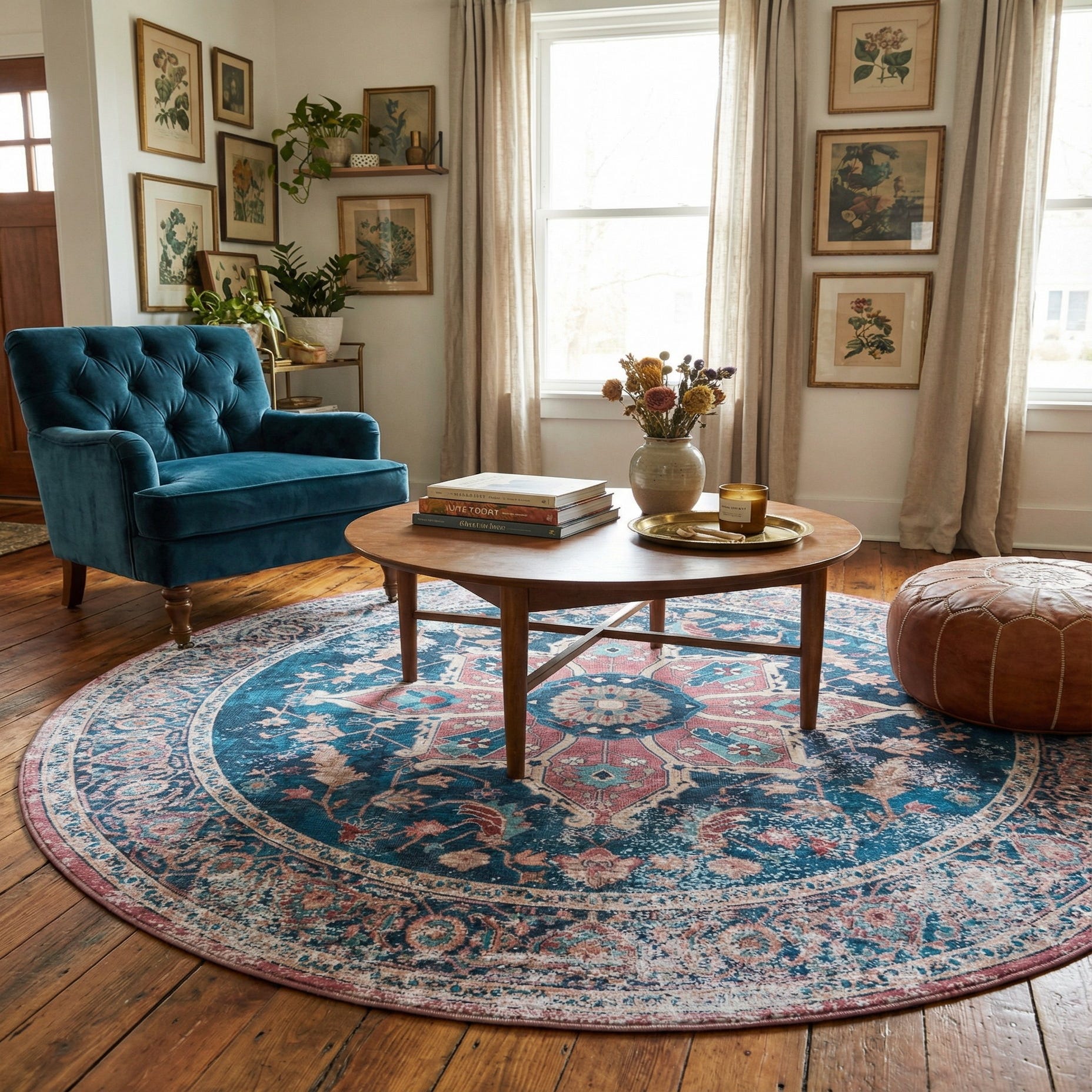 This rug works well beneath a round dining table or as a defining piece in a seating area where the medallion can be centered and appreciated. It pairs naturally with light or mid-tone wood furniture, linen upholstery, and metal accents in brass or matte black, and it complements interiors ranging from transitional and coastal to modern eclectic or cottage-style. Use it to add color and pattern to a bedroom sitting nook, an entry with a small vignette, or a living room where the navy field can anchor lighter textiles and blush or blue decorative accents.