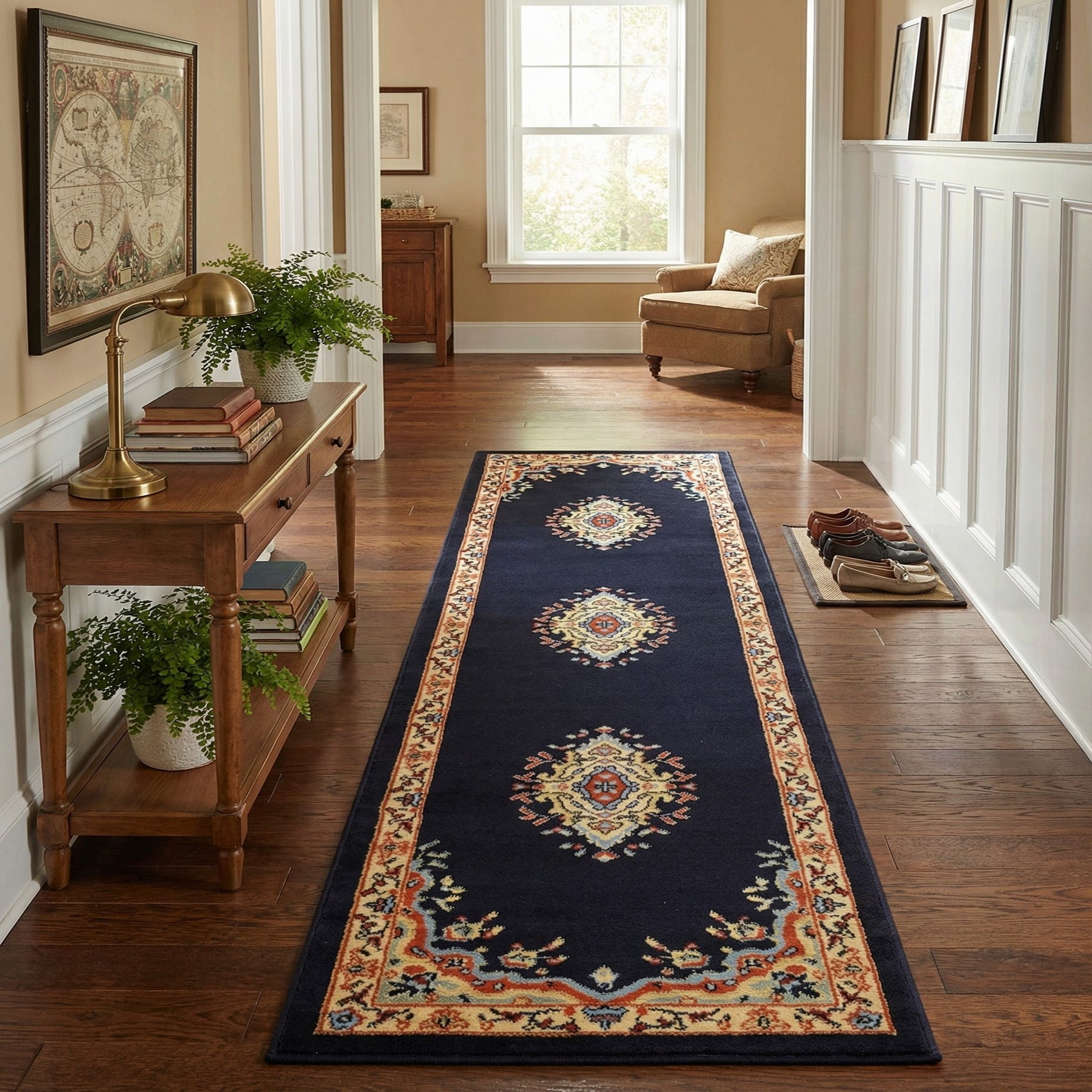 A navy blue 8 ft runner rug with a traditional oriental medallion pattern and a light-colored border, ideal for a hallway.