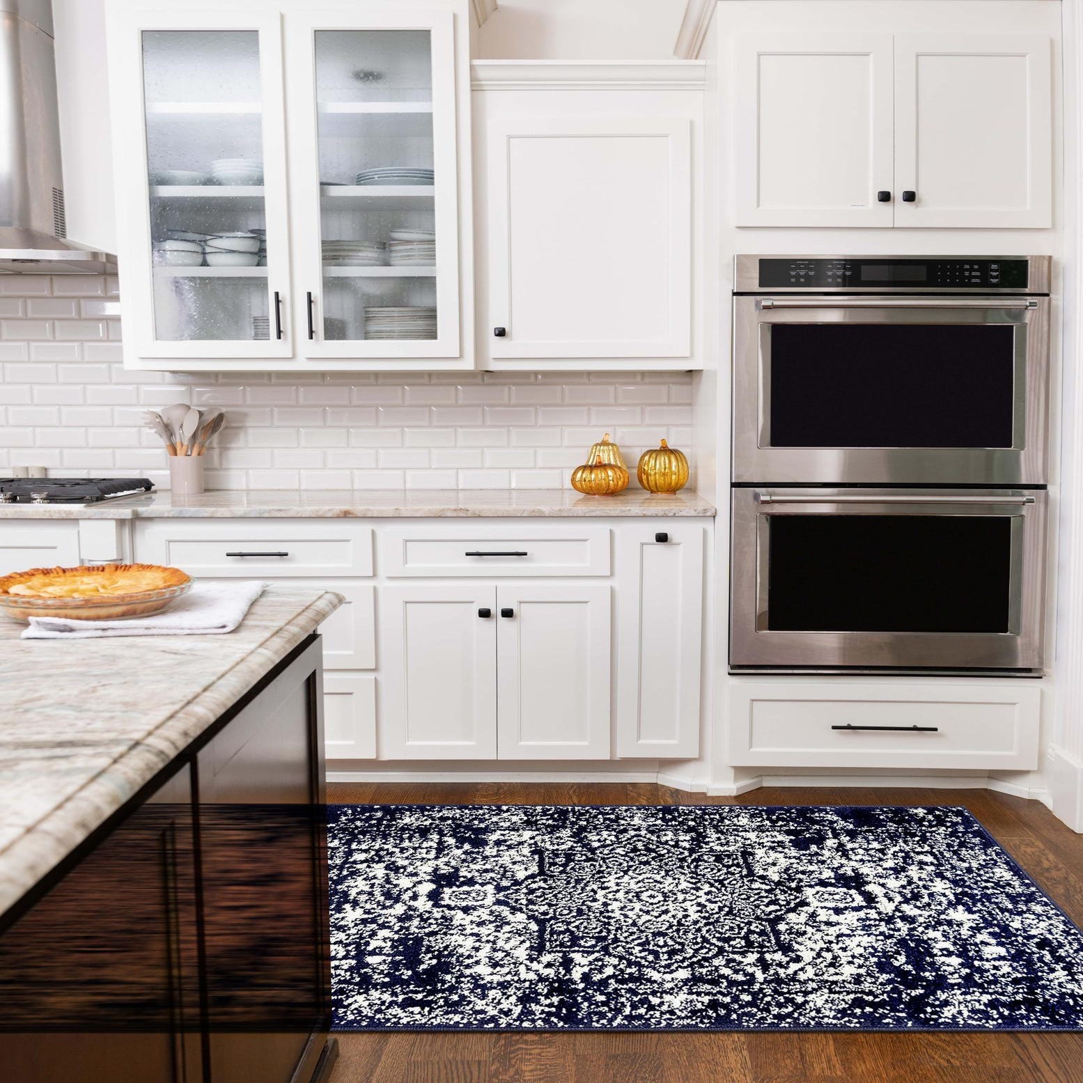 A navy blue and white 8 ft runner rug with a distressed traditional medallion pattern, ideal for a hallway or kitchen.