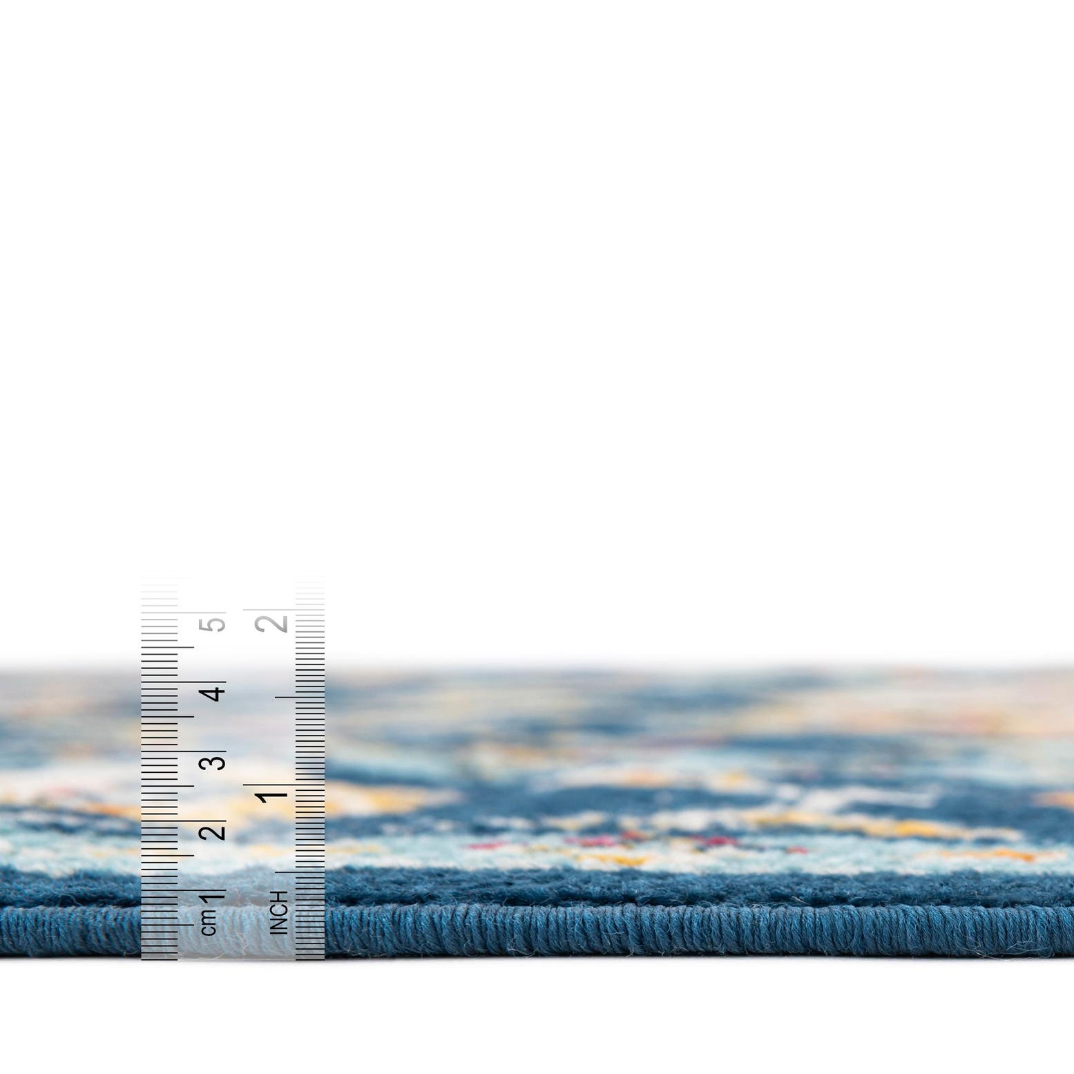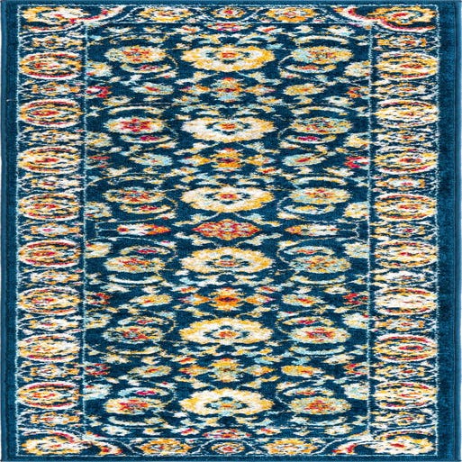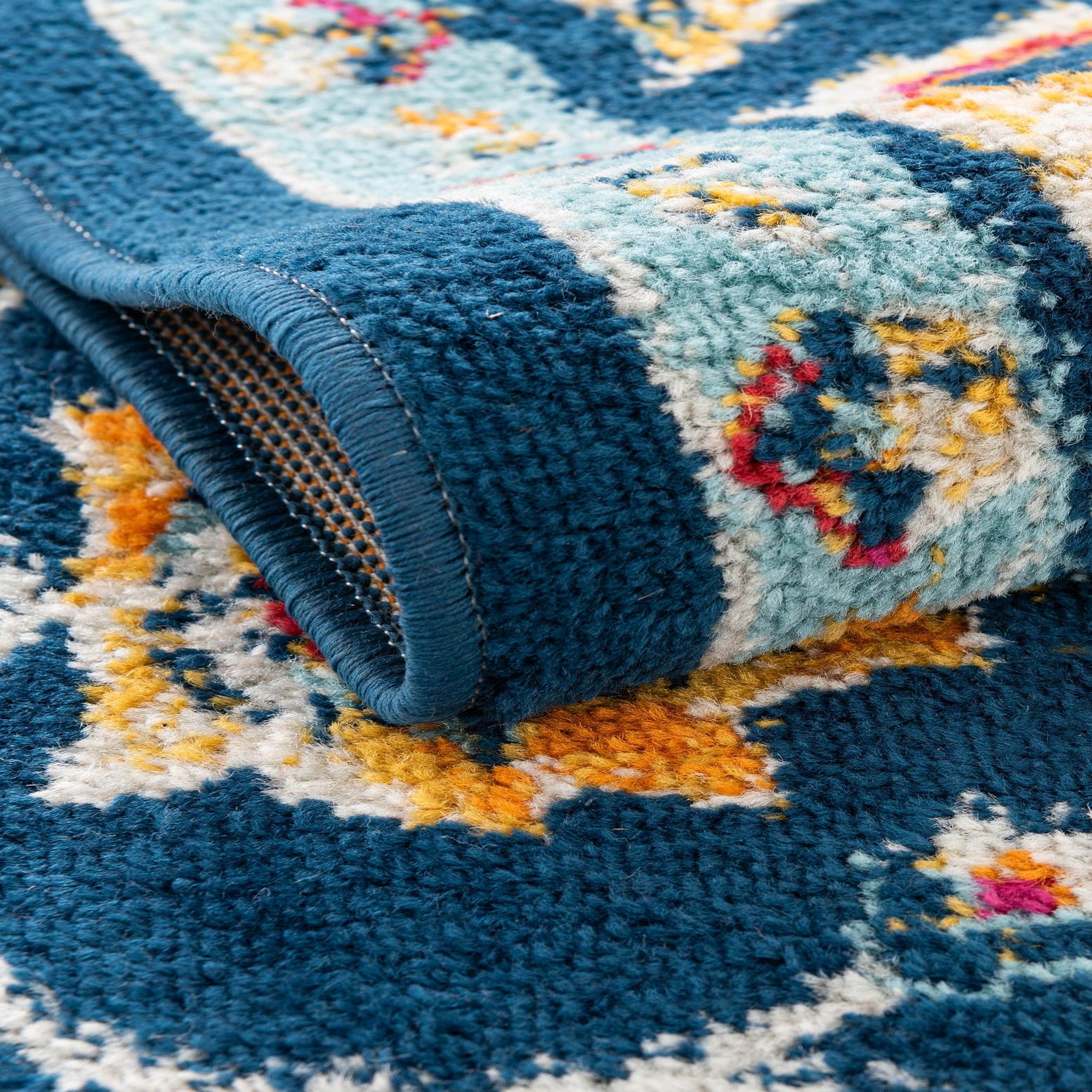 This runner displays a classic floral-medallion pattern with an ornate border that repeats along its length. A deep navy blue background anchors the design while bright pops of light blue, orange, red, yellow and green form the floral motifs and scrolling accents. Machine made from 100% polypropylene, the pile feels dense and slightly plush underfoot with clear, well-defined motifs and a subtle sheen that highlights the multicolor details.