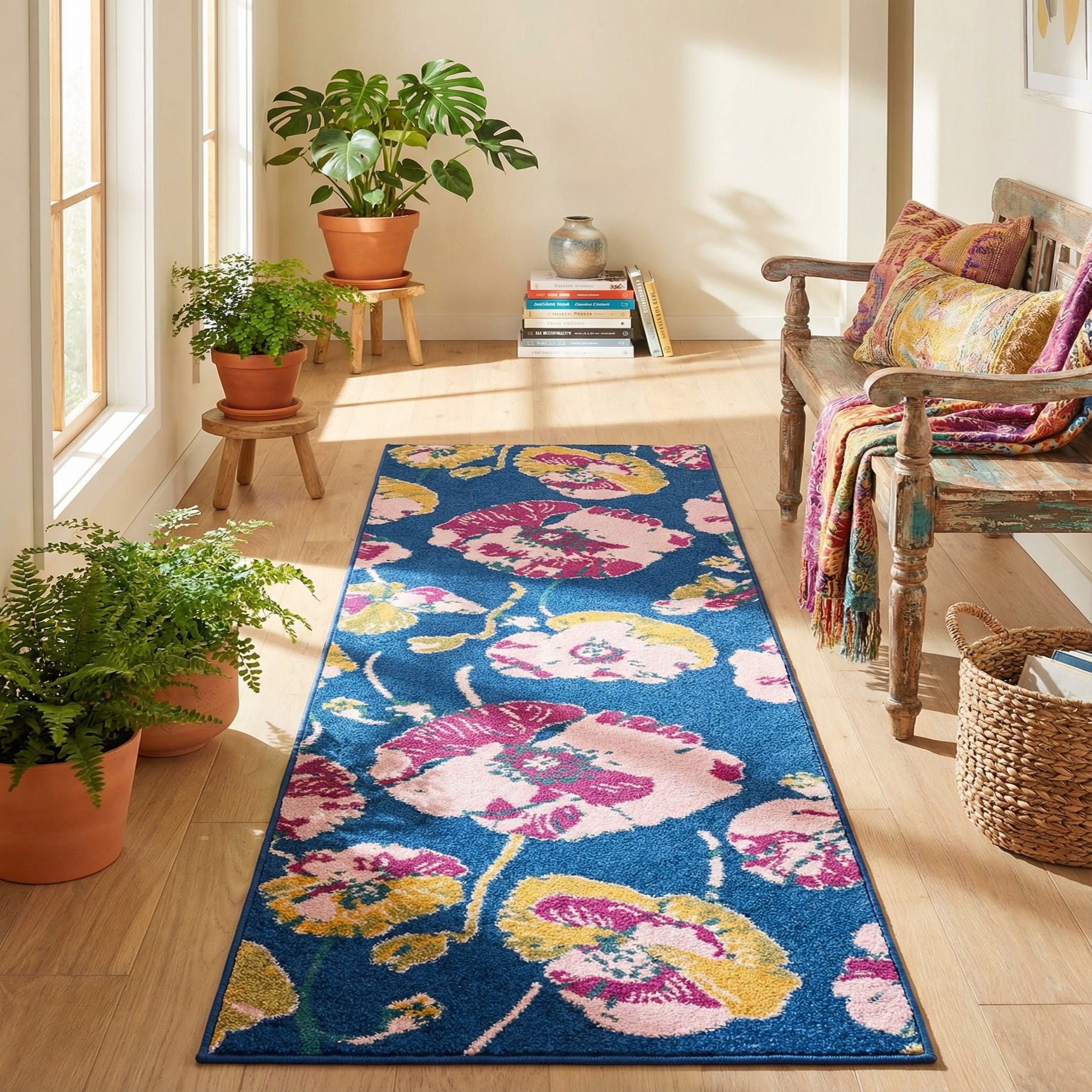 This runner works well in narrow or transitional spaces where you want a bold pop of color — think hallways, entryways, or alongside a kitchen island. Pair it with light wood or painted floors and simple, modern furnishings to let the pattern take center stage, or layer it into an eclectic room with mixed textiles and brass or matte-black accents for a playful, contemporary look.