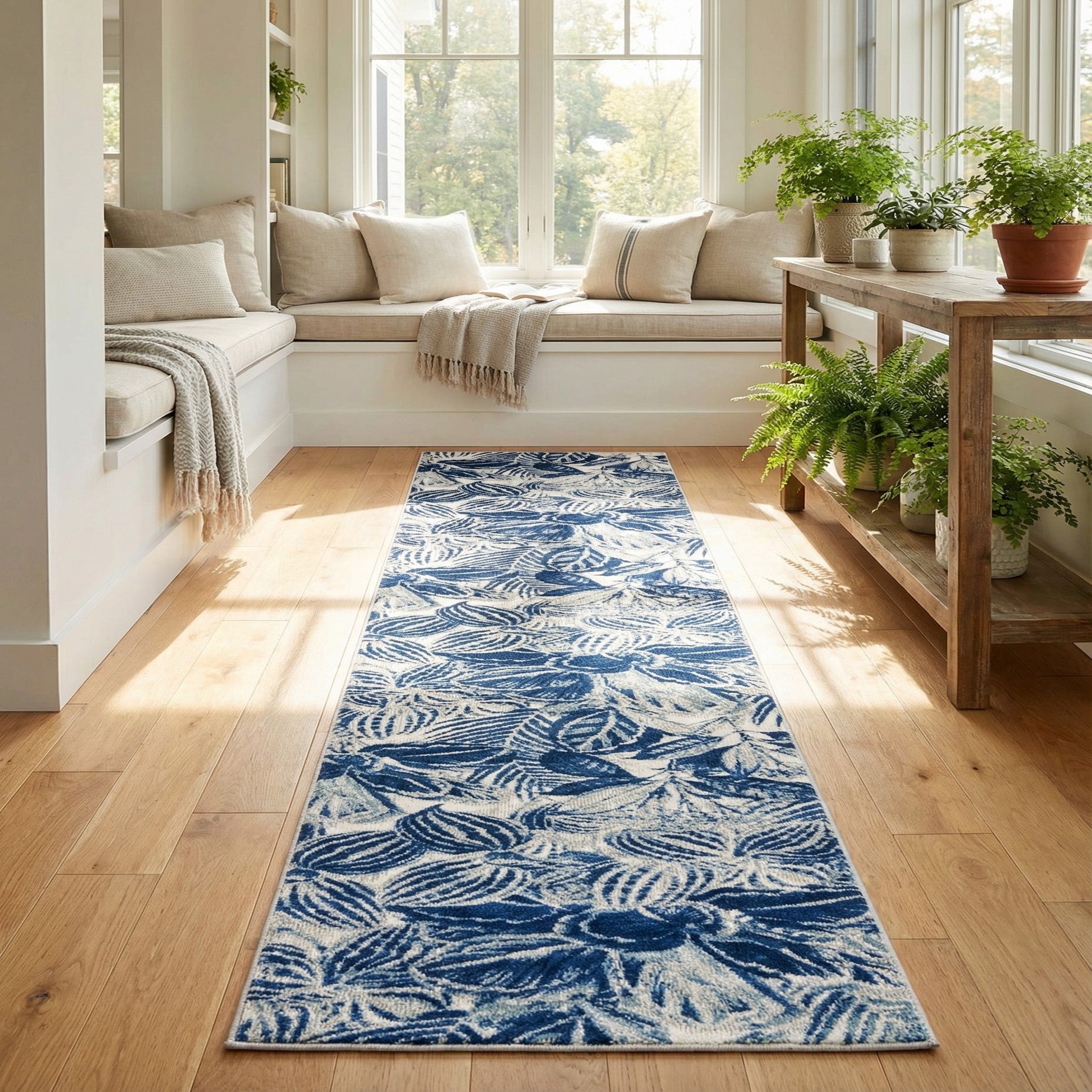 Machine made from 100% polypropylene, the rug has a low, dense pile that feels smooth underfoot and holds the pattern definition well. Its scale and shape make it ideal for hallways, entryways, or a long kitchen galley; it pairs naturally with white-painted trim, light-washed wood floors, navy cabinetry, or woven rattan furnishings in contemporary, coastal, or transitional interiors.
