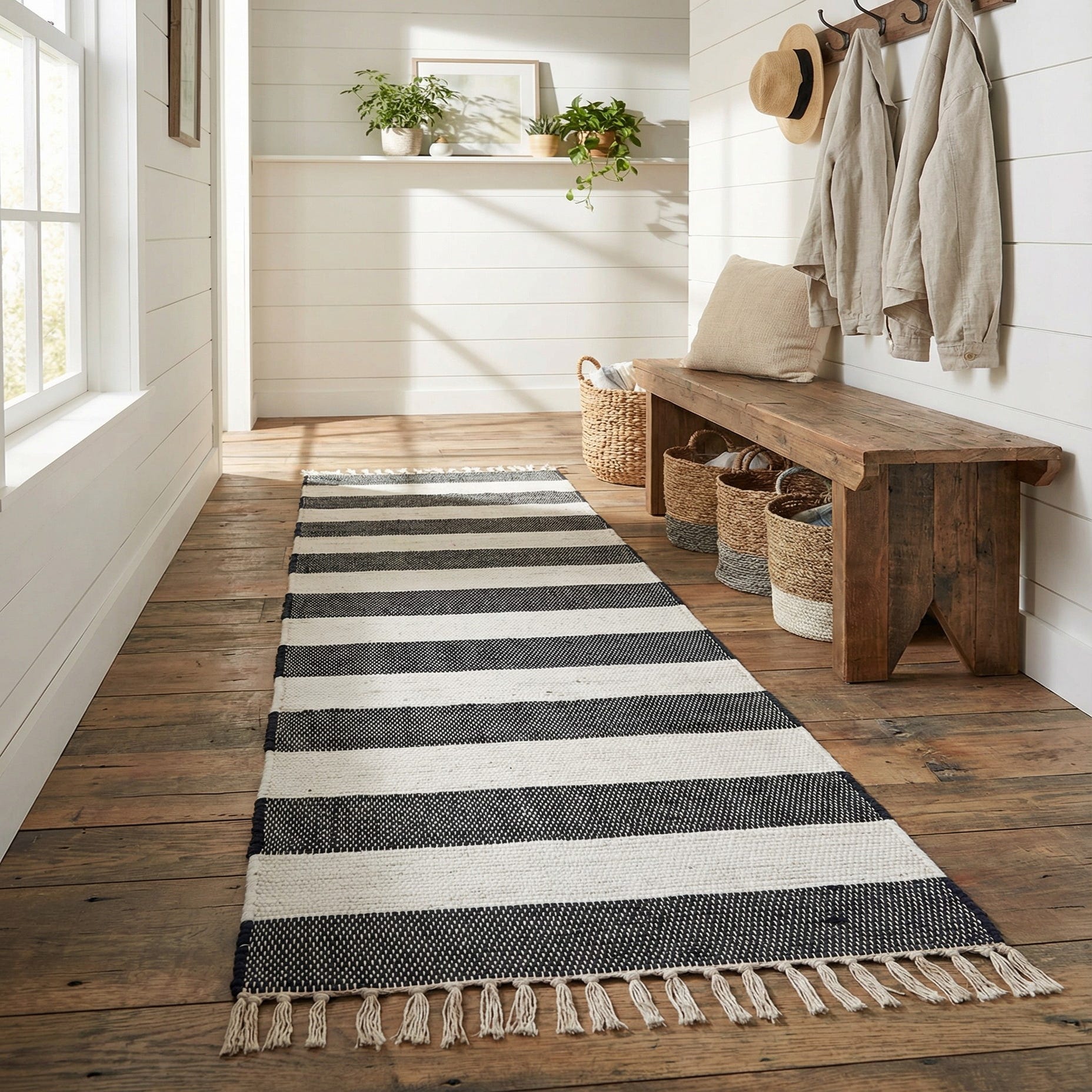 This runner works well in a long entry, hallway, or kitchen galley and layers nicely in front of a sofa or against hardwood and painted floors. Pair it with warm wood tones and woven baskets for a relaxed, coastal feel, or combine with matte black hardware and neutral upholstery for a more modern, minimalist setting. The bold stripe makes it easy to coordinate with solid linens, simple geometric accents, or textured throws.