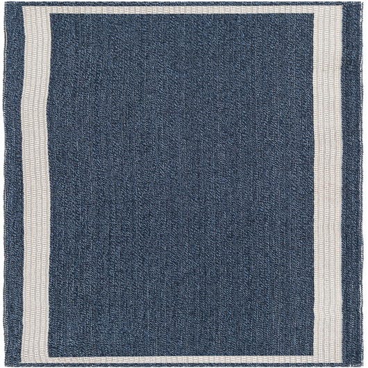 A clean, tailored runner with a deep navy-blue field framed by a crisp ivory inner border. The pattern is deliberately simple: a tightly woven, flat surface with subtle thread variation that gives the navy a gentle, heathered texture rather than a solid block of color. Machine-made from 100% cotton, the weave has a low-profile, slightly textured hand that lies flat underfoot and highlights the contrast between the navy background and the ivory trim.