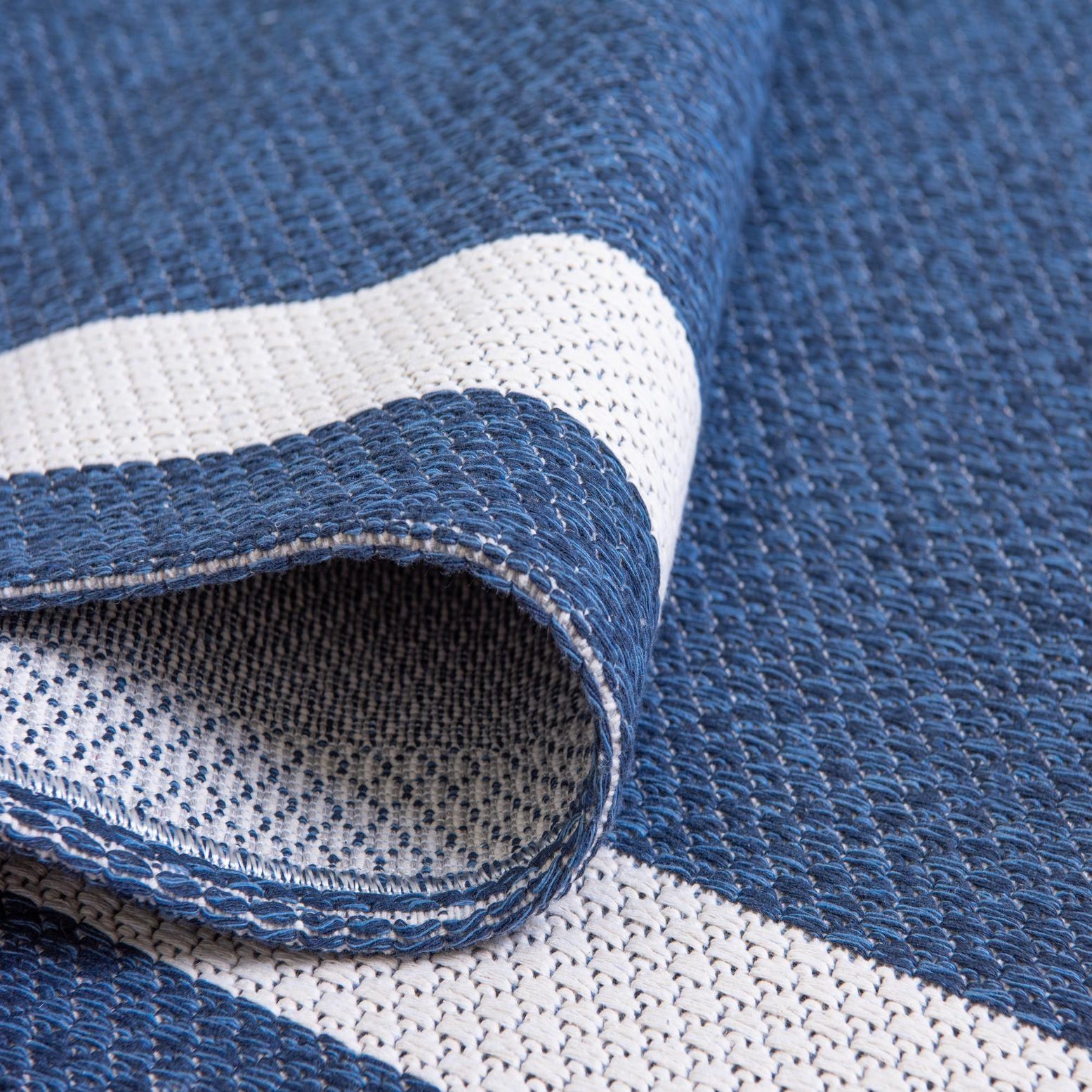 A navy blue 8 ft runner rug with a clean, light beige border, featuring a flatweave texture.