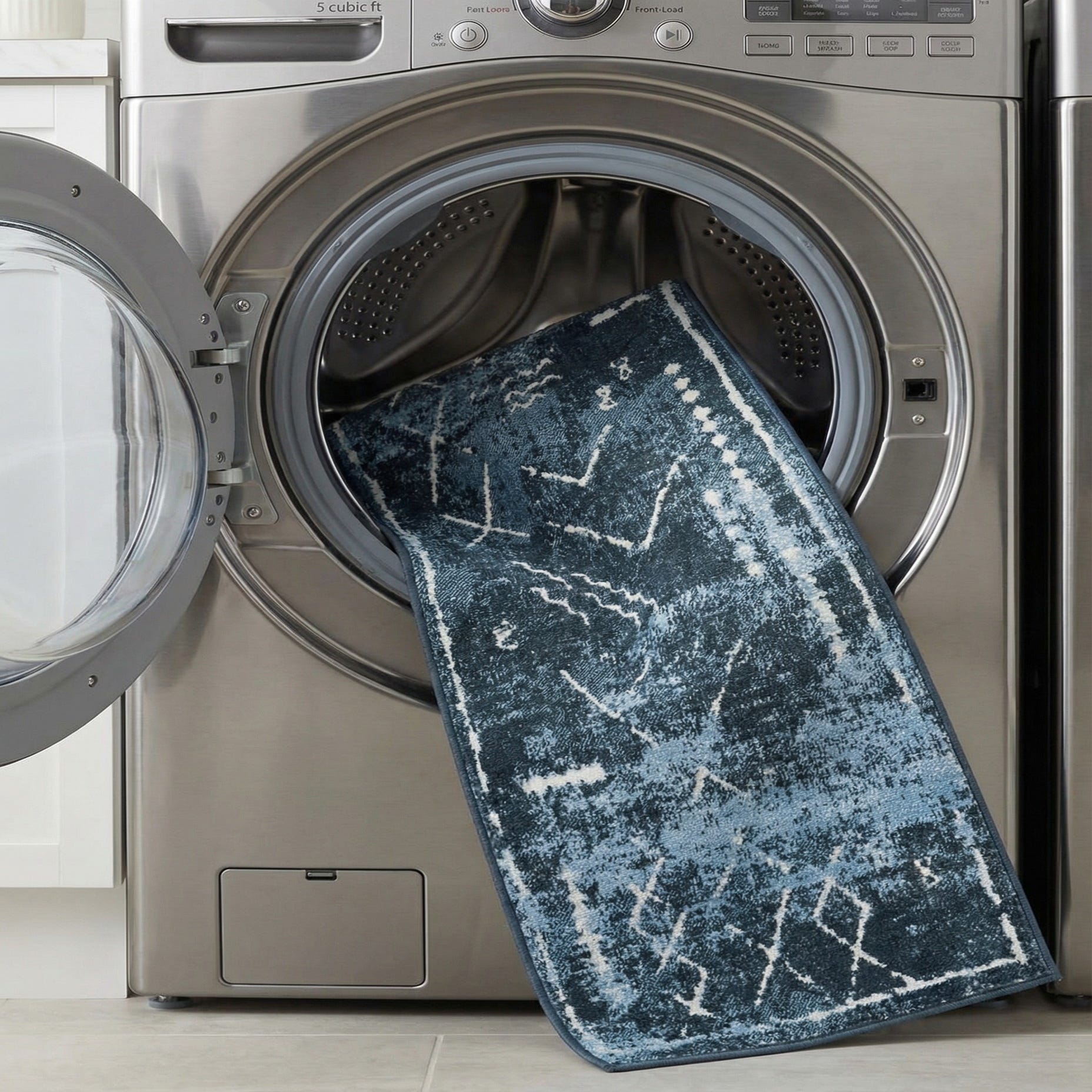 A navy blue and light blue Kamala Washable 8 ft runner rug with a distressed vintage tribal pattern, ideal for a hallway.