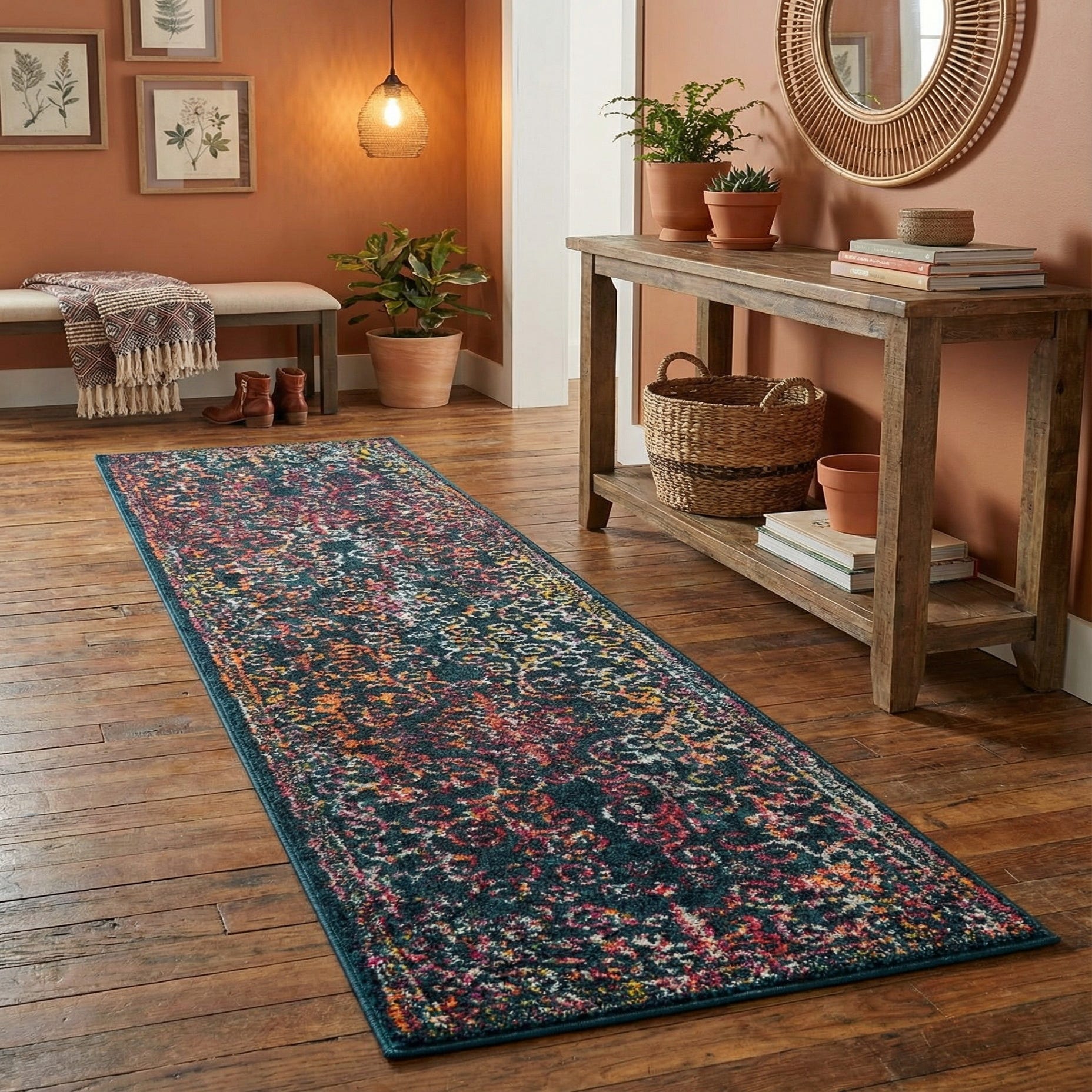 This Madeline collection runner would work exceptionally well in designs that embrace bohemian chic, where its rich color spectrum can be paired with eclectic furnishings and accessories. Conversely, it can serve as an artful statement piece in a minimalist setting, where its bold design brings warmth and dimension. Alternatively, traditional decors will benefit from this runner's classic charm, tying in wood elements and richly hued textiles to create a cohesive and inviting space.
