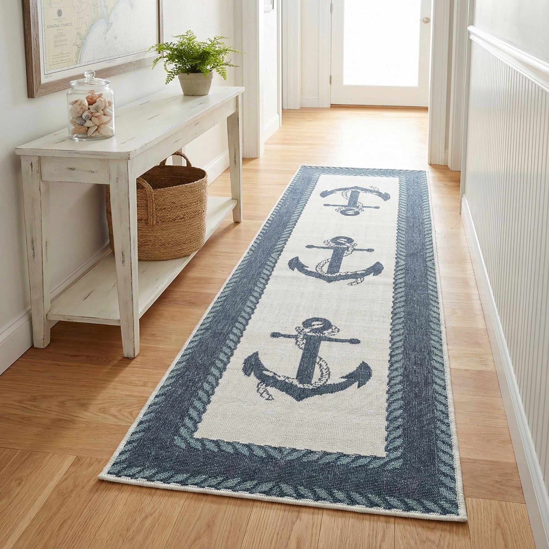 The long, narrow layout works well in hallways, entryways, or along a galley kitchen, and pairs naturally with coastal, cottage, or casual lake-house interiors. Combine it with whitewashed wood, wicker or rattan furniture, light blue textiles, and weathered metal accents for a relaxed seaside look, or use it on a covered porch to bring nautical character to outdoor-adjacent spaces.