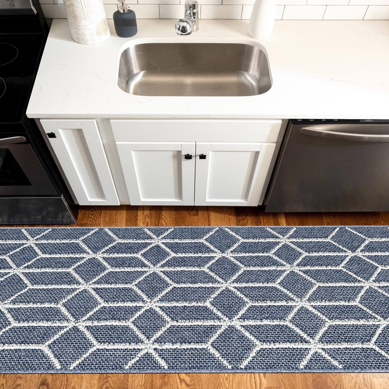 Thanks to its construction and materials, this runner offers a blend of comfort and practicality, providing a smooth surface underfoot with a texture that’s designed to resist wear. The navy blue and ivory color combination is versatile enough to suit a wide range of decor styles, from coastal-inspired spaces to more contemporary urban interiors, and is particularly well-suited to areas where a durable yet stylish accessory is desired.