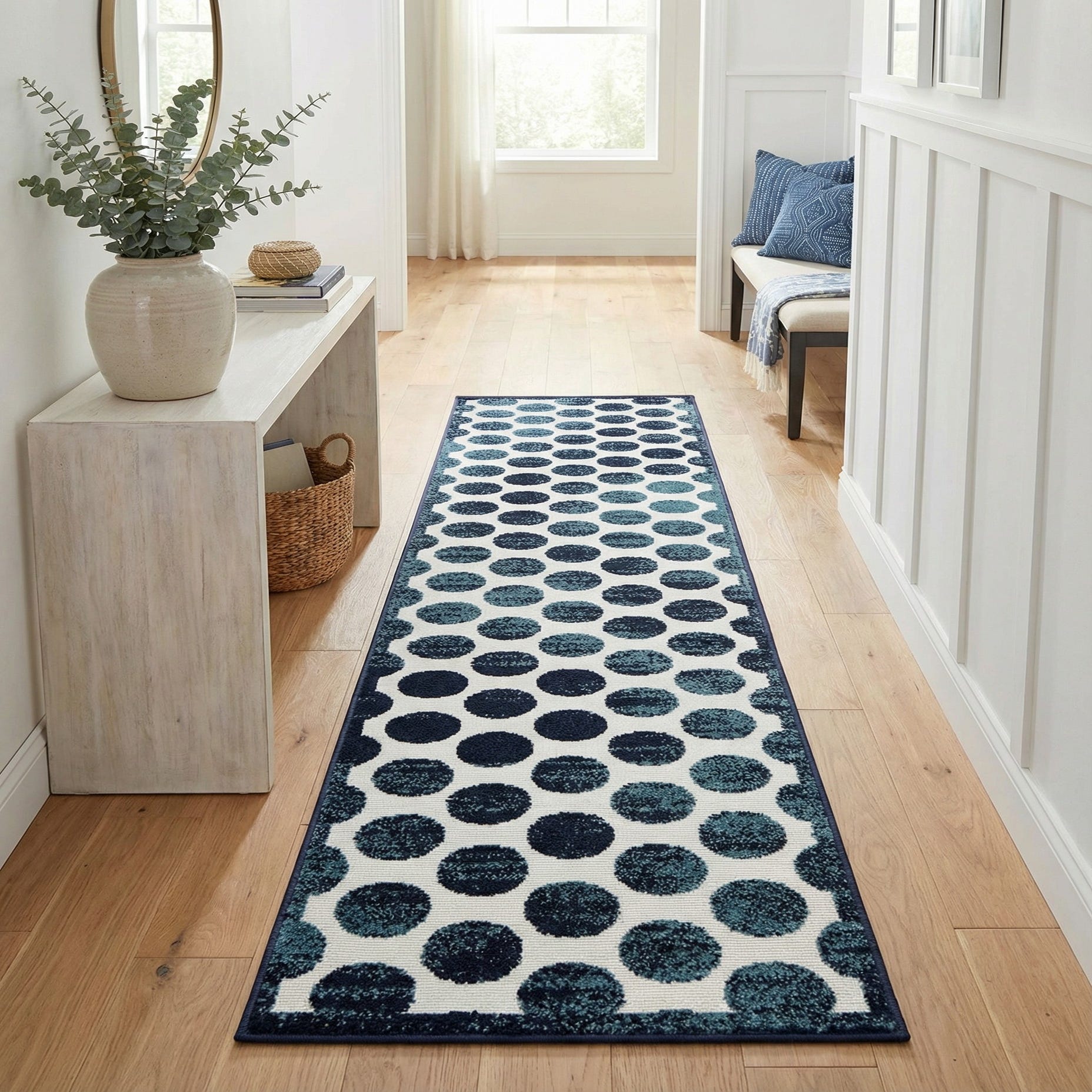 This runner works well in a coastal or contemporary entryway, where the navy-and-blue palette pairs with whitewashed wood, linen upholstery, and brushed metal accents. It also fits nicely in a modern hallway, mudroom or balcony, bringing a playful yet composed graphic rhythm to narrow spaces and high-traffic routes. Use it to anchor a casual dining nook or to add pattern to a minimalist corridor without overpowering surrounding decor.