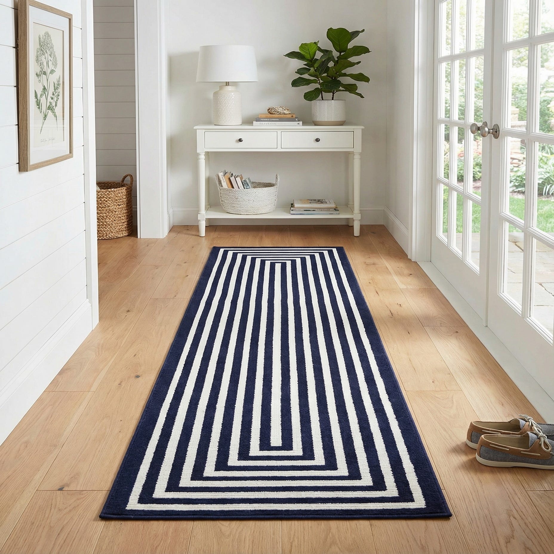 This runner complements coastal, modern, or transitional schemes—place it in an entryway to anchor white-painted trim and natural wood benches, layer it on a covered porch alongside wicker seating and navy cushions, or use it in a narrow kitchen or hallway to add a bold linear statement. Its classic color pairing and structured pattern work well with brass or matte black accents and simple, streamlined furnishings.