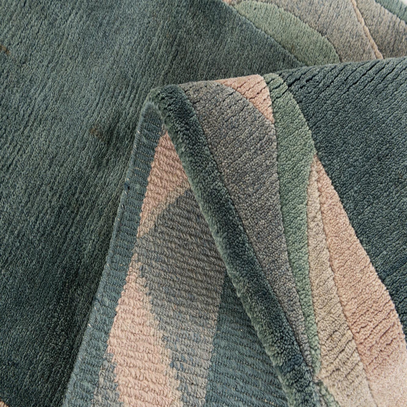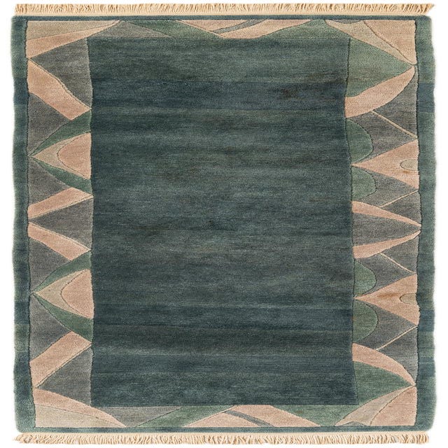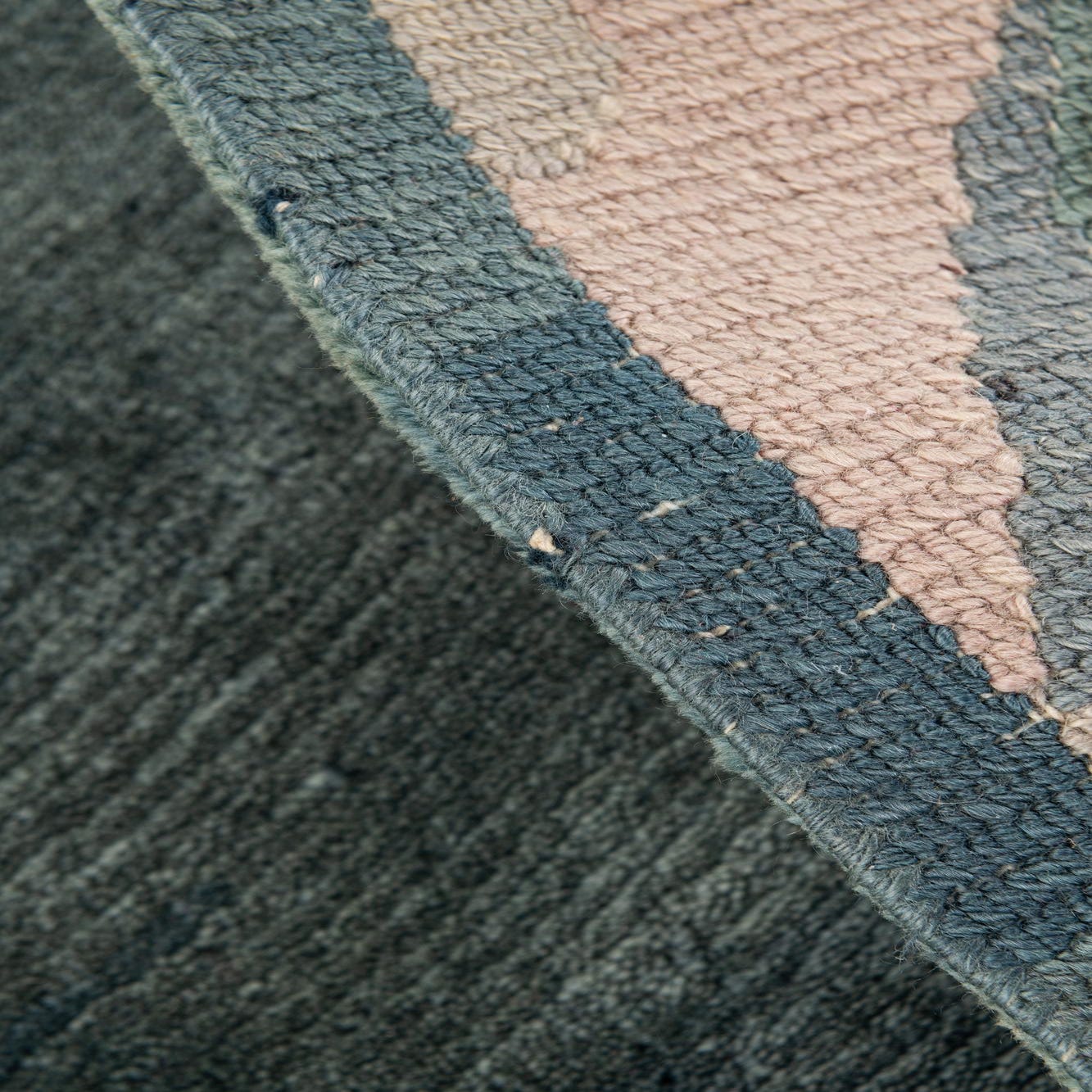 A handmade 8 ft runner rug with a deep blue center and an abstract border in shades of blue, green, and beige, perfect for a hallway or kitchen.