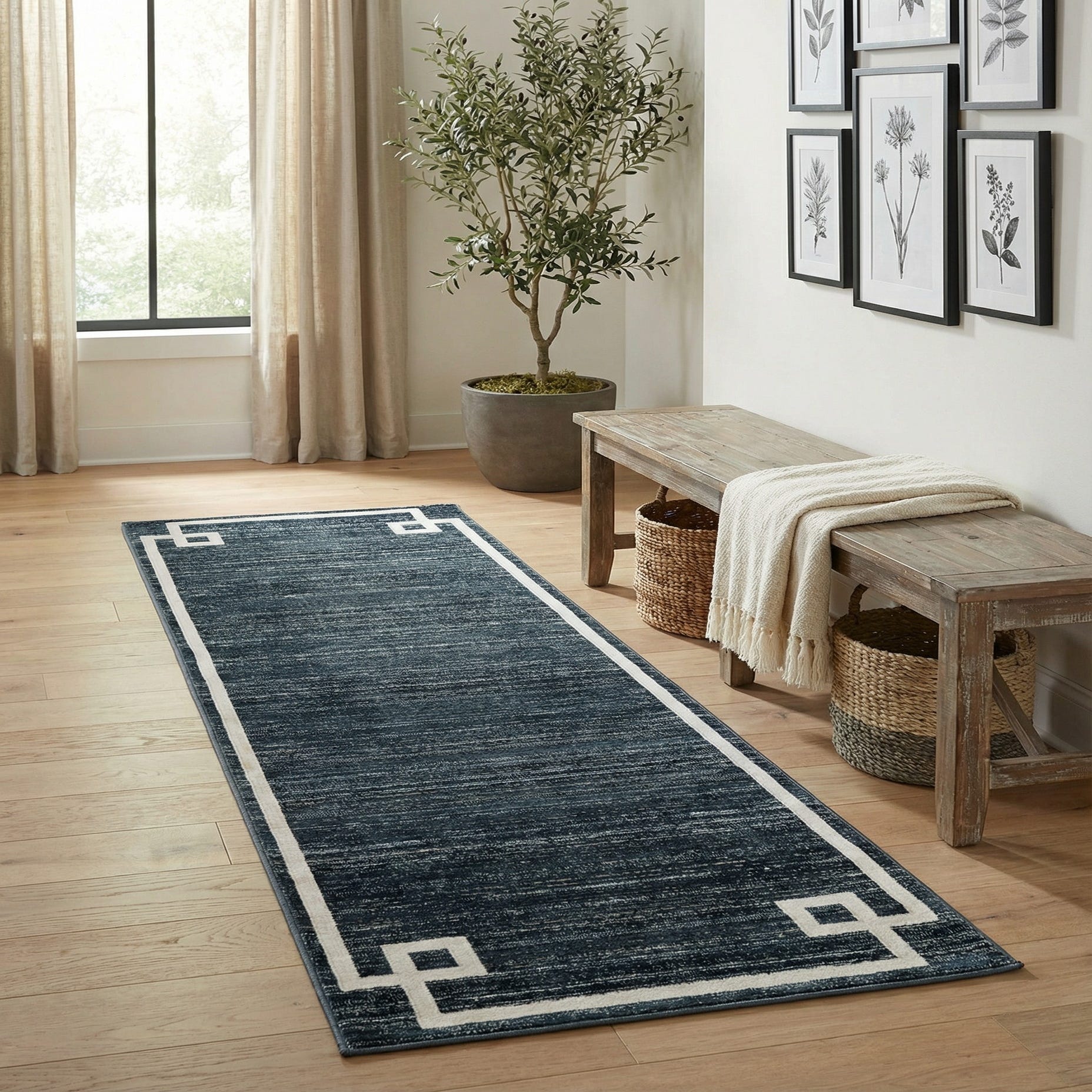 A deep navy-blue ground woven with subtle tonal striations gives this machine-made runner a textured, layered appearance. An ivory linear border frames the field and culminates in squared, geometric corner motifs that echo a Greek-key influence, adding a modern, architectural detail. Constructed from 70% polypropylene and 30% polyester, the low-profile pile has a soft hand with a gentle luster that feels comfortable underfoot.