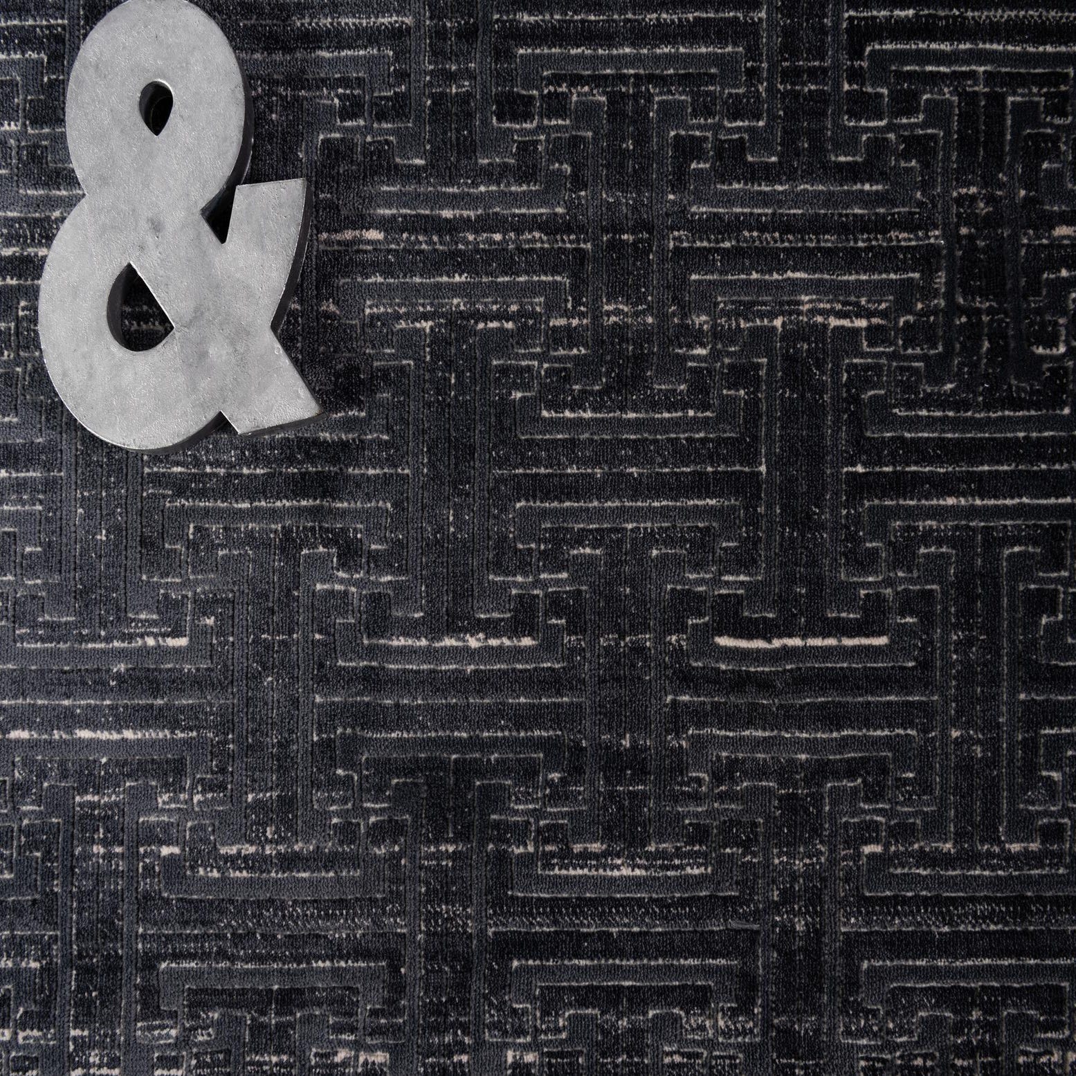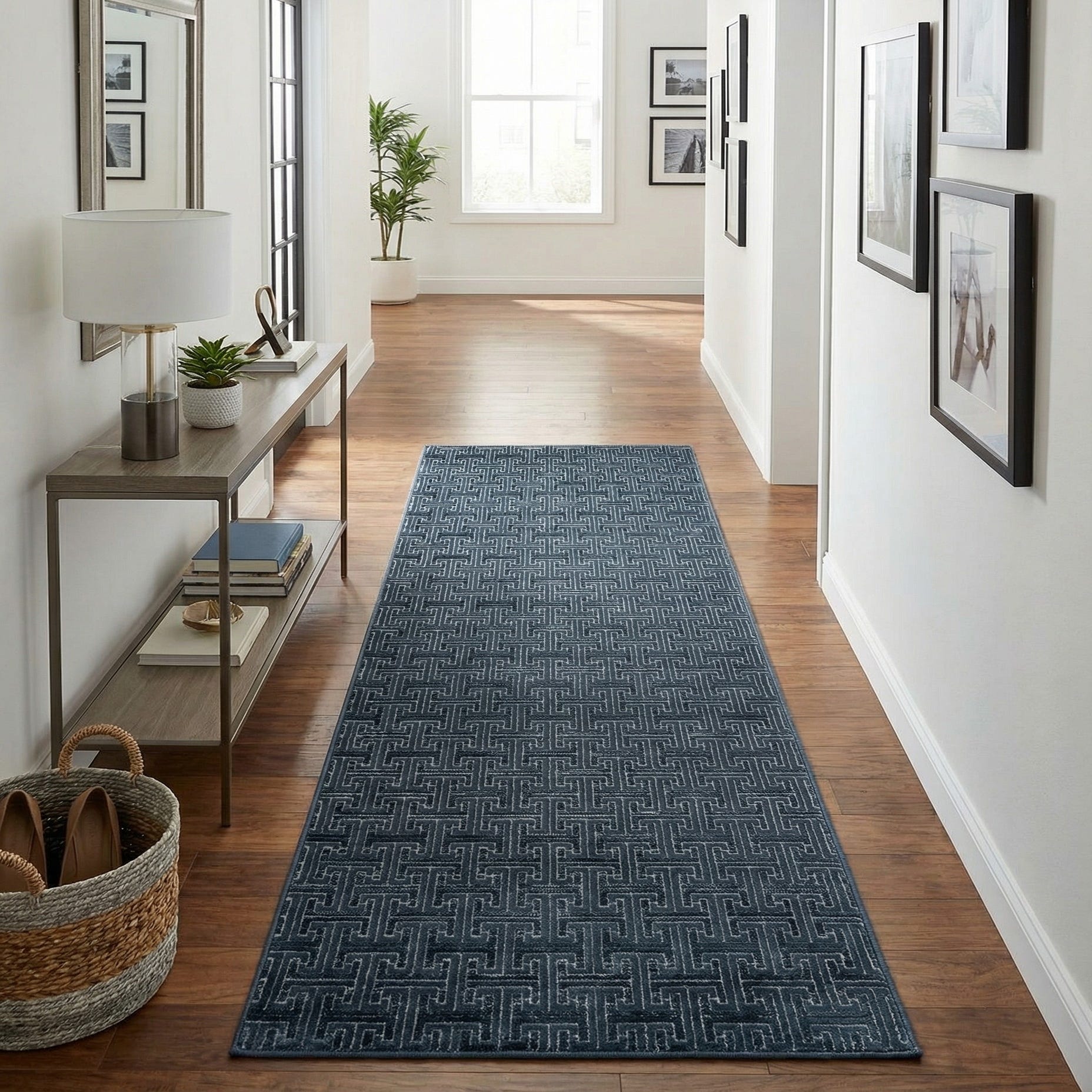 A long, thin 8 ft runner rug in shades of navy blue, featuring a modern, industrial geometric pattern with a textured pile, ideal for a hallway.