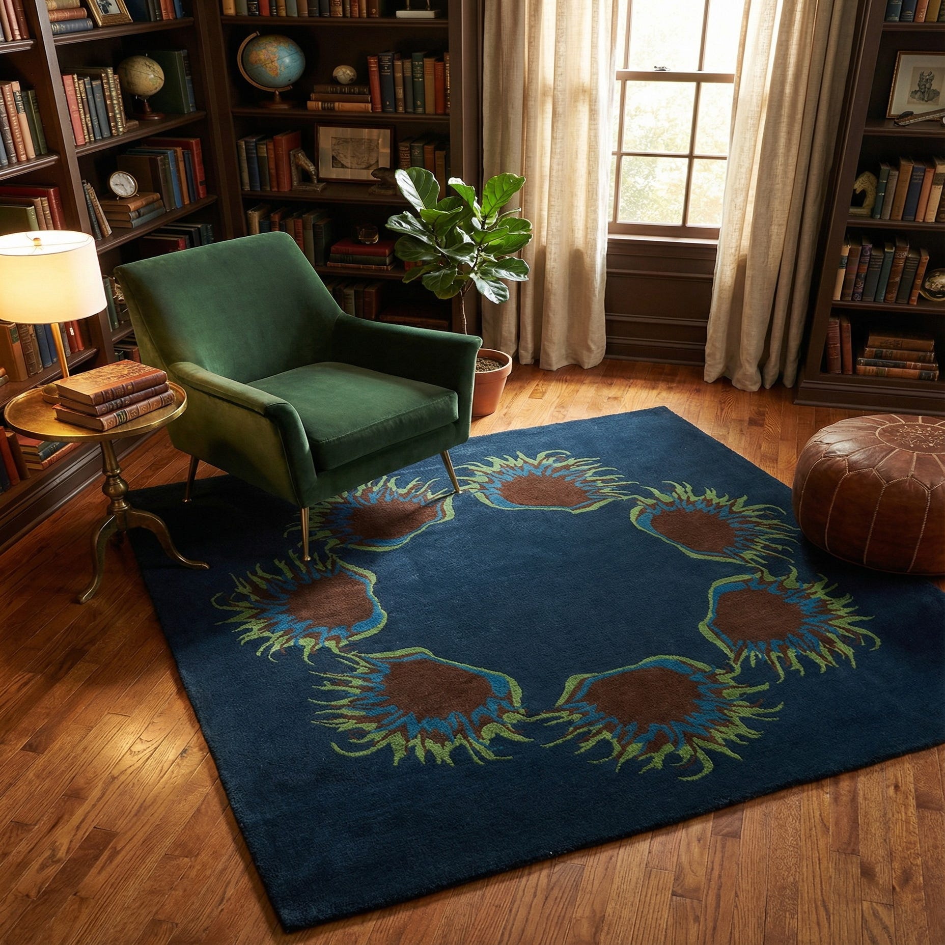 This Agra collection rug is a hand-tufted piece, meticulously crafted from a blend of wool and cotton, offering both durability and soft texture. Its size at 8 feet square provides ample coverage for a variety of spaces. The rug features a striking pattern set against a rich navy blue background, accented by hues of blue, brown, and green. The distinctive floral motif gives the design a unique and artistic flair, making it a focal point in any room.