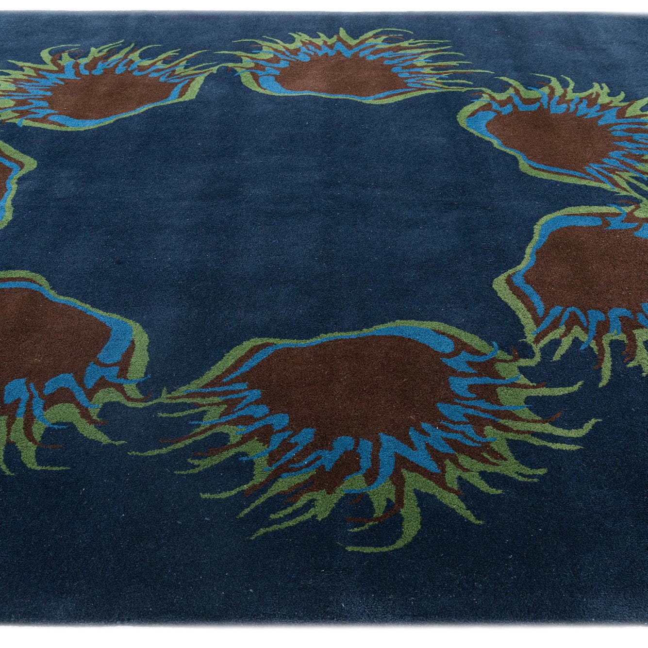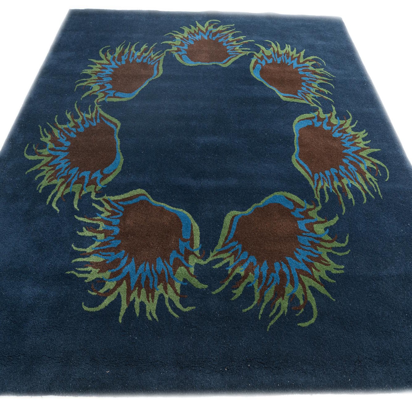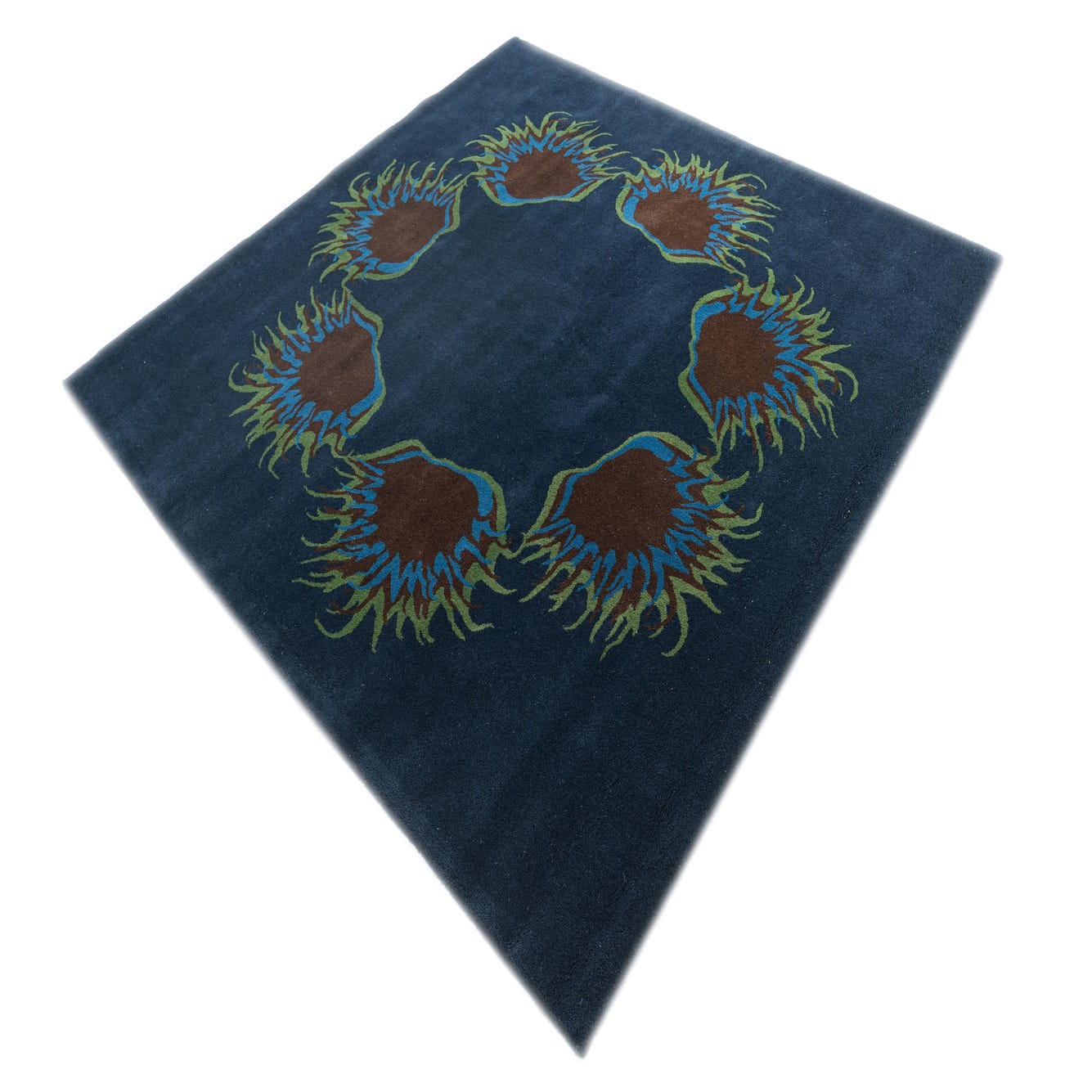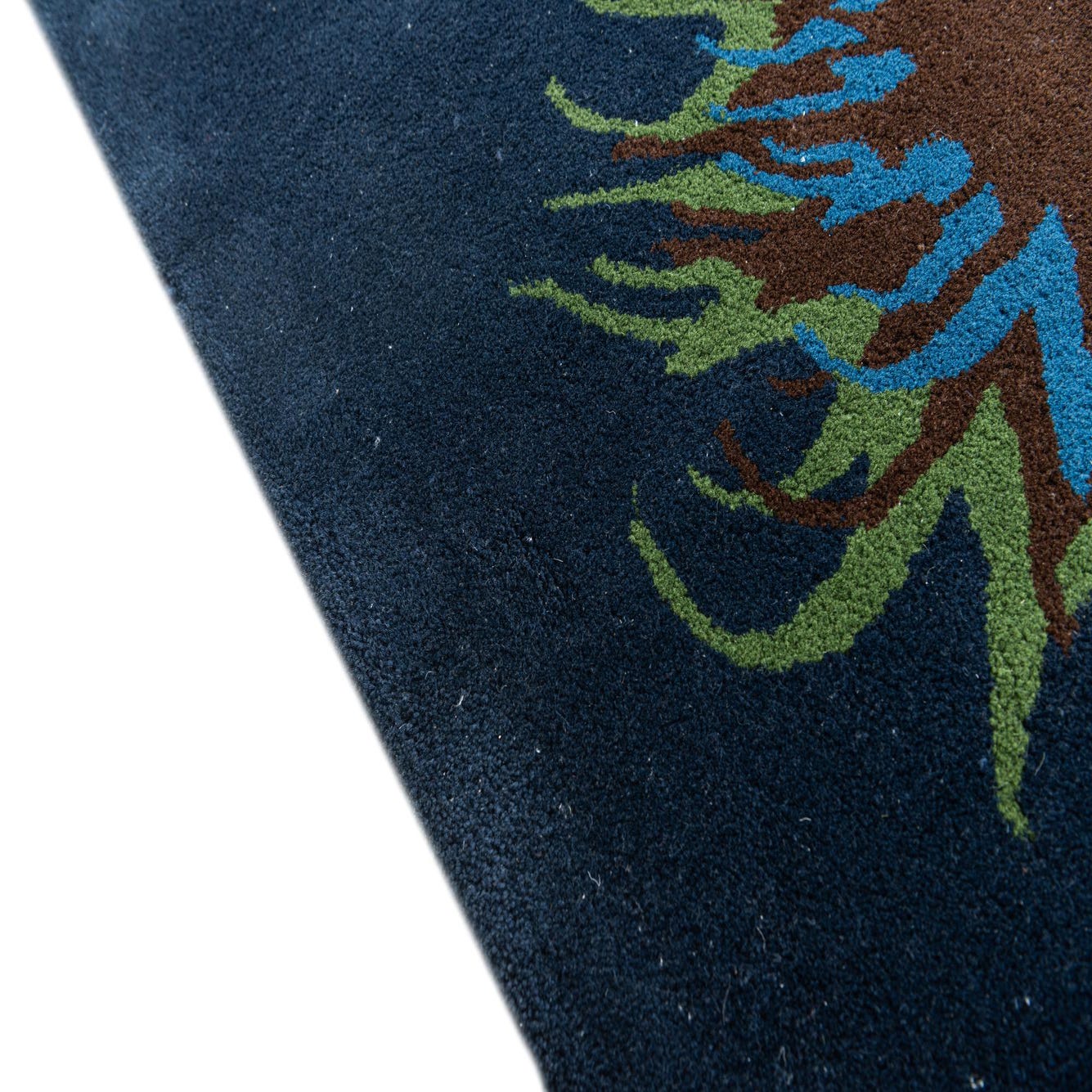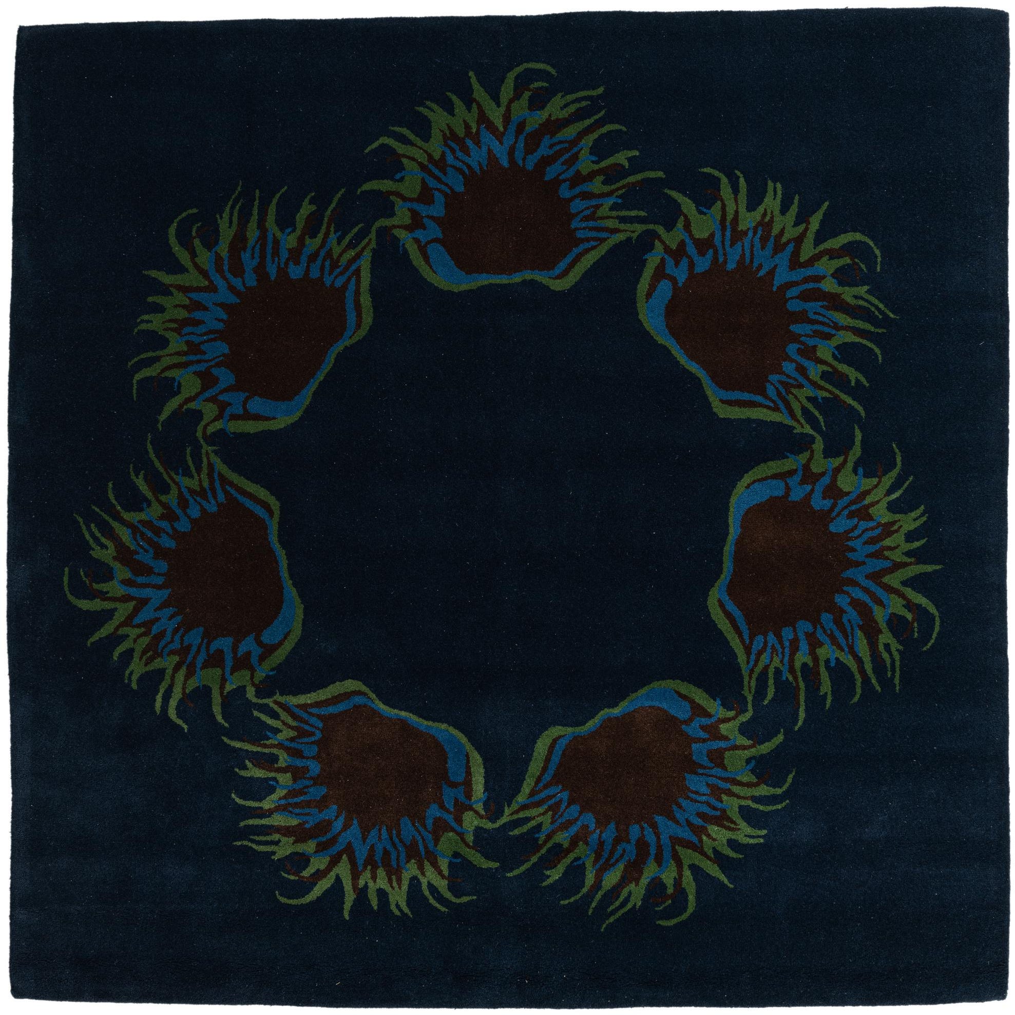 A square navy blue wool rug with a central circular floral pattern in brown, teal, and olive green.