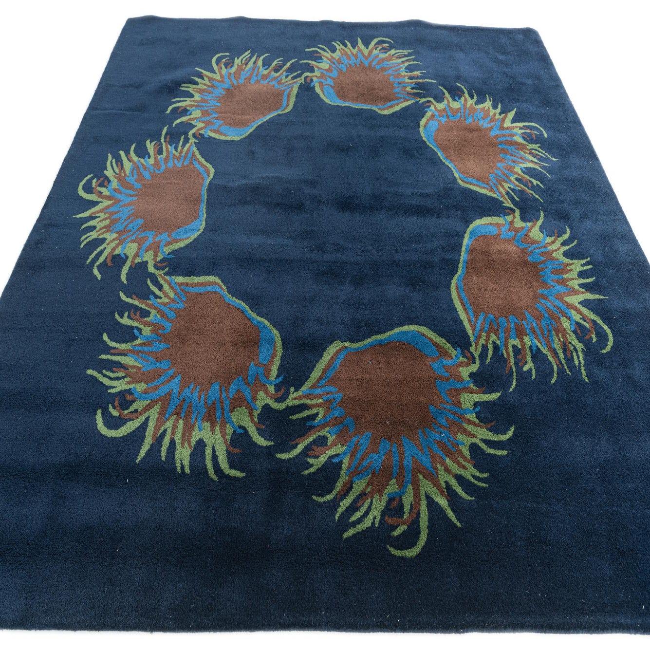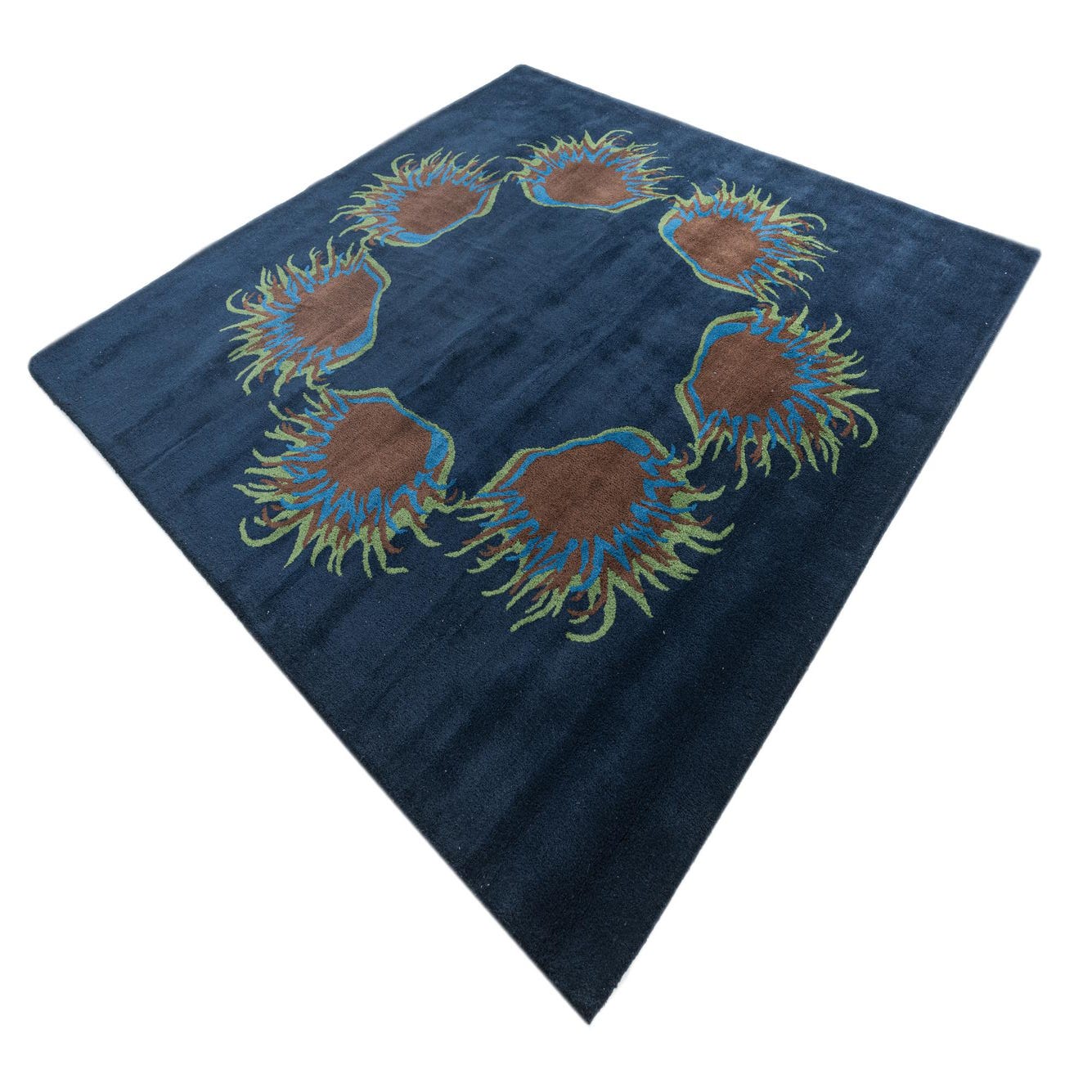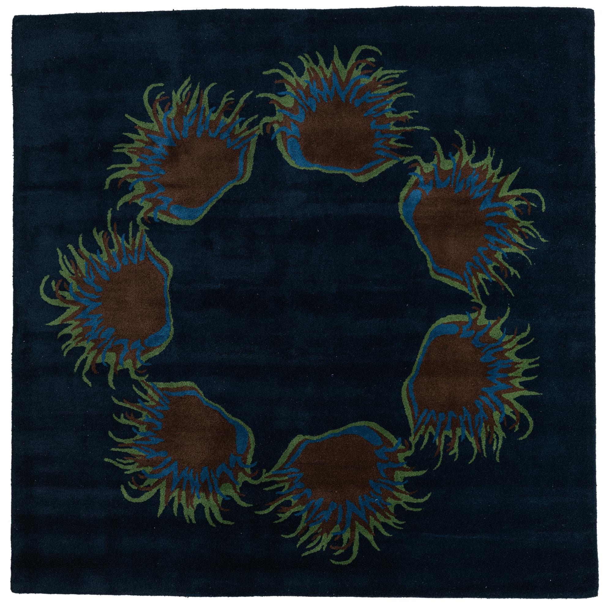 A square navy blue wool rug featuring a circular pattern of brown, blue, and green floral bursts.