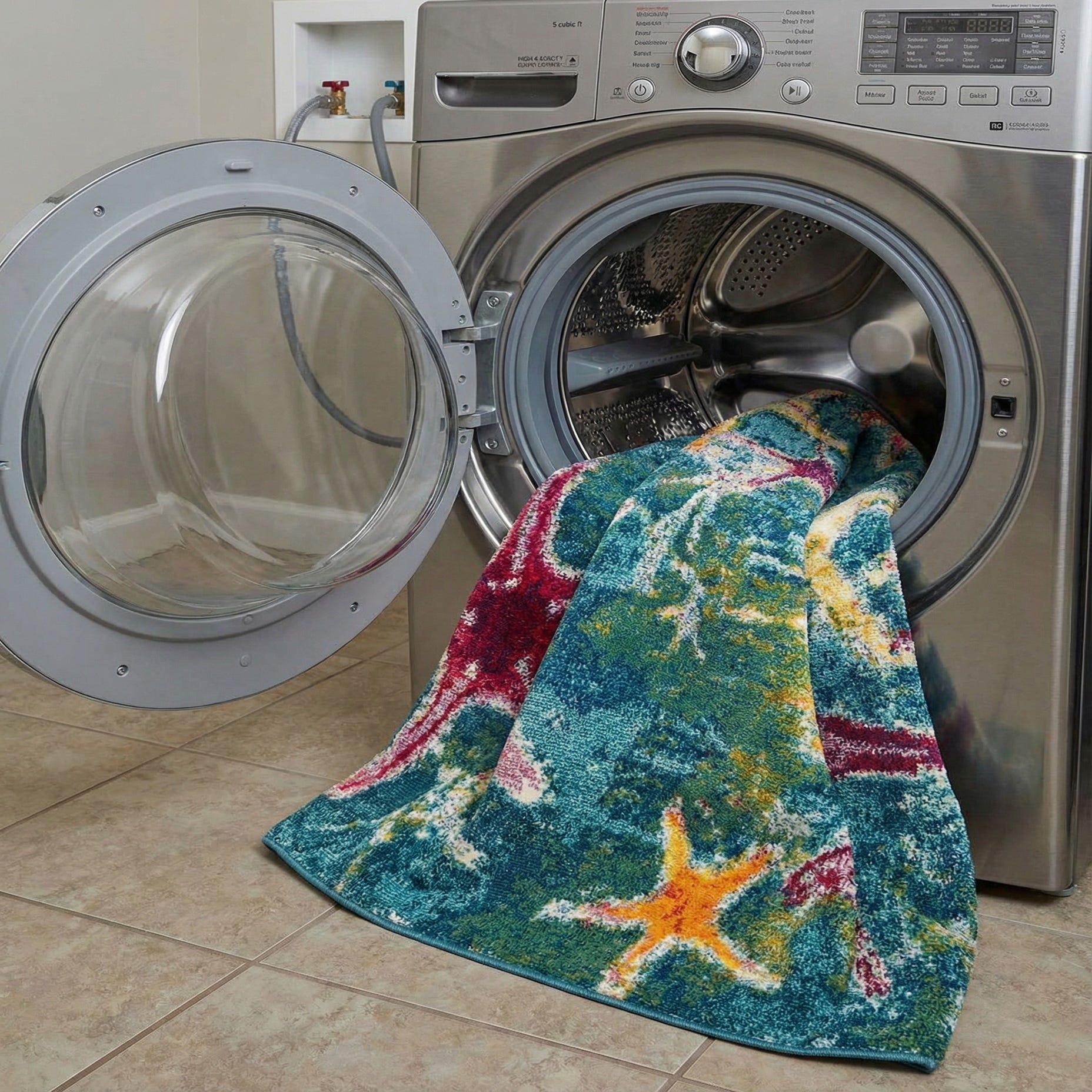 A square blue area rug featuring a modern beach/nautical pattern of colorful starfish in shades of orange, yellow, and purple.