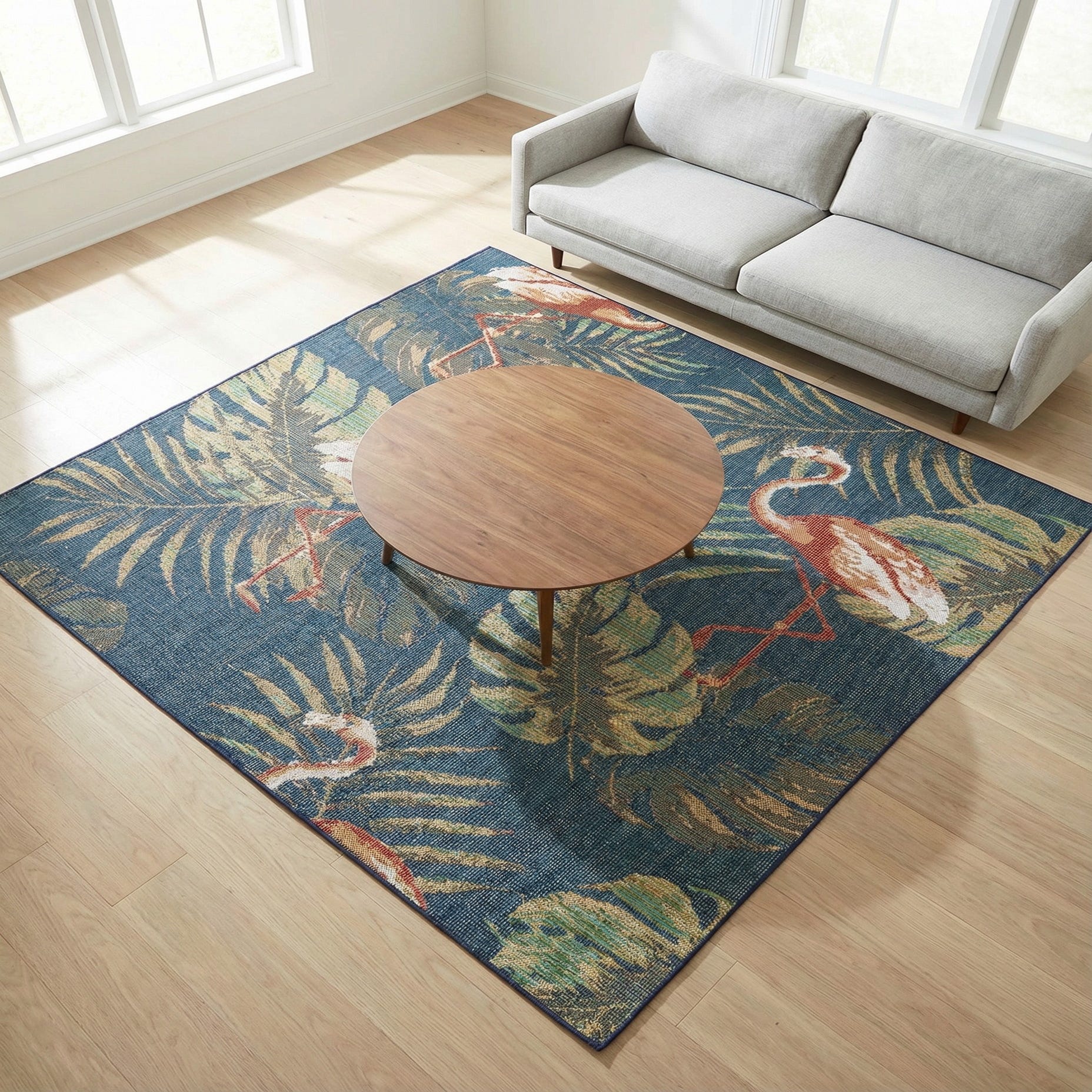 A square navy blue indoor/outdoor rug featuring a vibrant botanical pattern with pink flamingos and green and gold palm leaves.