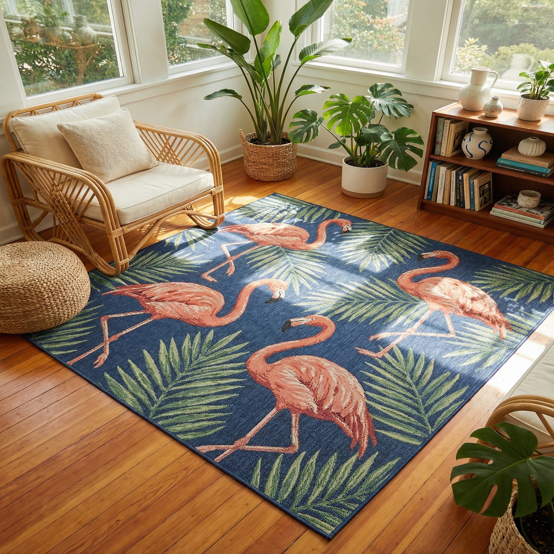 A square navy blue indoor/outdoor rug featuring a vibrant botanical pattern with pink flamingos and green and gold palm leaves.