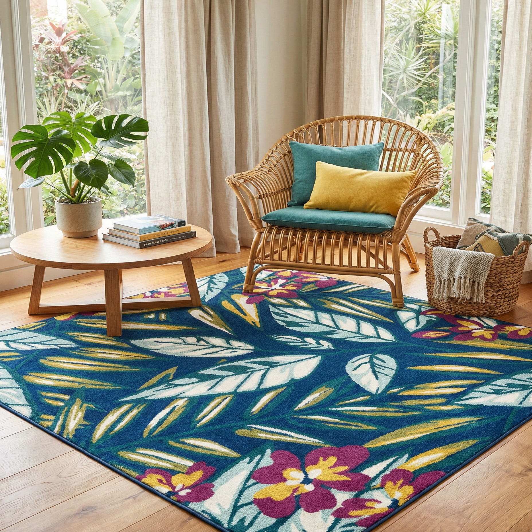 Machine-made from 100% polypropylene, the rug has a dense, low-to-medium pile with a smooth, slightly plush hand that feels pleasant underfoot while keeping the printed pattern crisp. Place it as a vibrant anchor in a living room with neutral sofas and natural wood tones, brighten a sunroom or covered porch with rattan seating and white linens, or add a fresh, colorful layer to a coastal or modern-bohemian bedroom. Pair with solid pillows or woven textures to echo the rug’s colors without competing with the pattern.