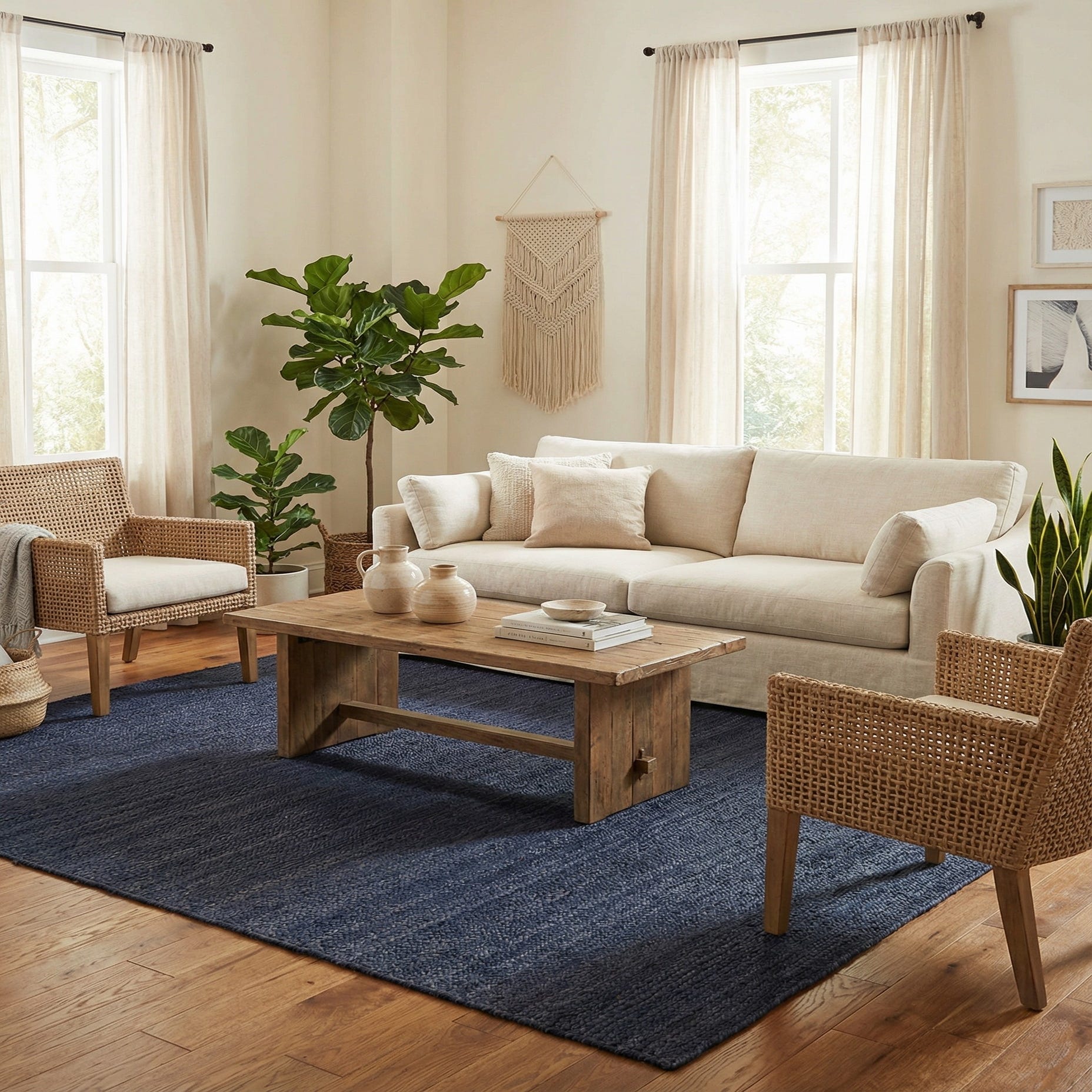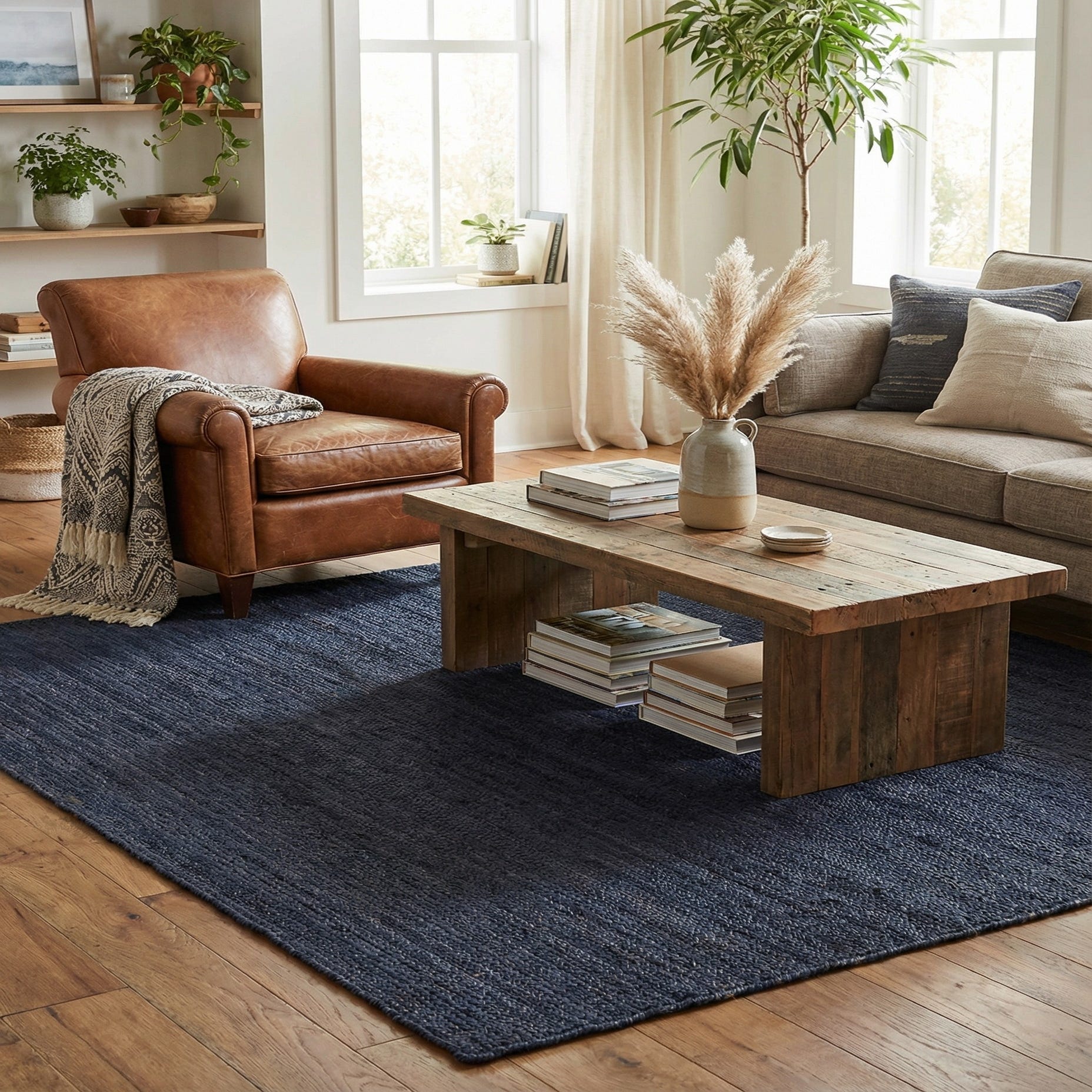 This piece works well in casual living rooms, coastal or farmhouse interiors, and modern spaces that need an organic counterpoint to clean lines. Place it under a coffee table to anchor seating, layer it beneath a dining table for added texture, or use it in an entry or home office to introduce natural warmth. Pair with warm wood tones, leather seating, off?white linens, or matte metal accents for a balanced, lived-in look.