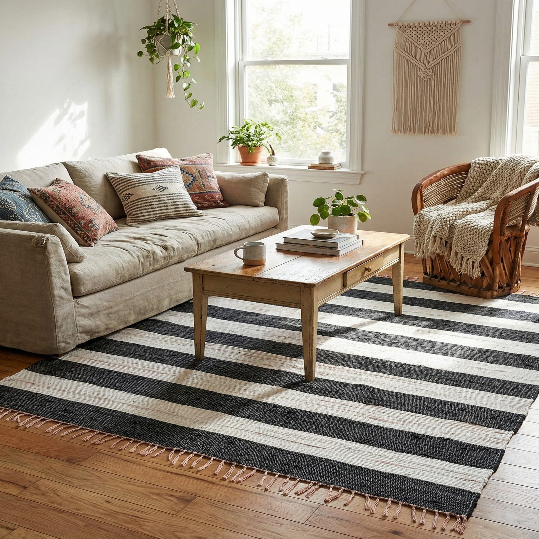 The clean stripe pattern and navy-and-ivory palette work well with coastal, modern farmhouse, or Scandinavian-inspired interiors. Place it to anchor a casual living room seating area, beneath a round dining table to add contrast, or layered over hardwood for added texture in an entry or hallway. It pairs particularly well with natural wood tones, neutral upholstery, and matte metal accents for a composed, lived-in look.