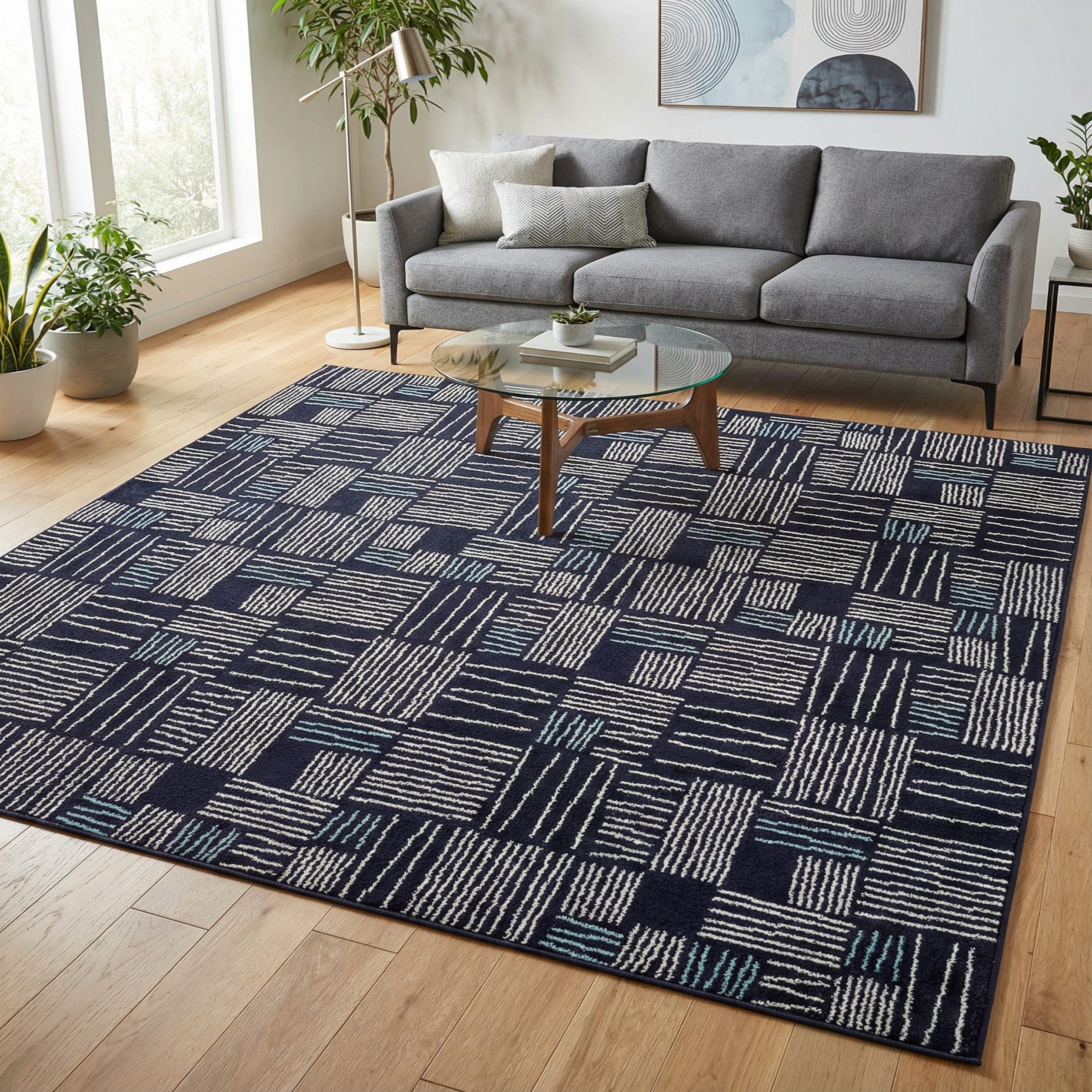 The Hanahan collection offers a sophisticated 8 Ft Square rug Machine Woven of 100% Polypropylene that adds a stately presence to any room. This rug showcases a bold navy blue background imbued with contrasting ivory and light blue hues, creating a dynamic pattern reminiscent of geometric abstraction and digital pixelation. The well-defined lines contribute to a structured and contemporary aesthetic.