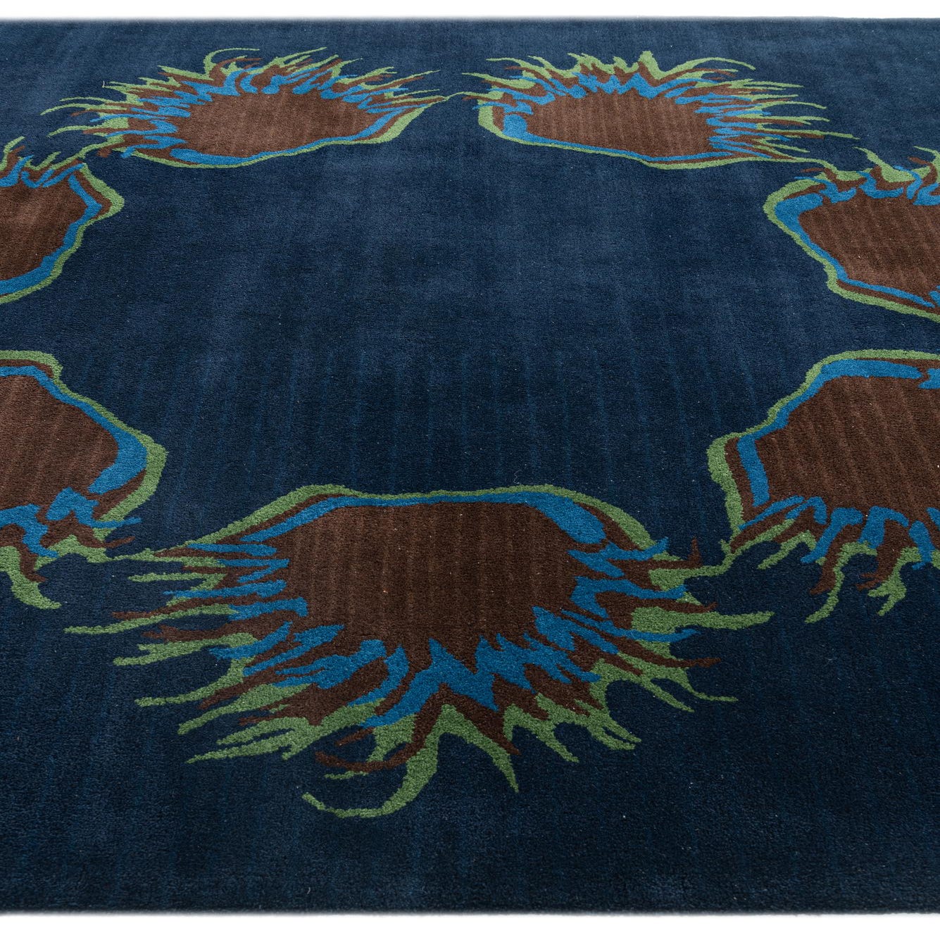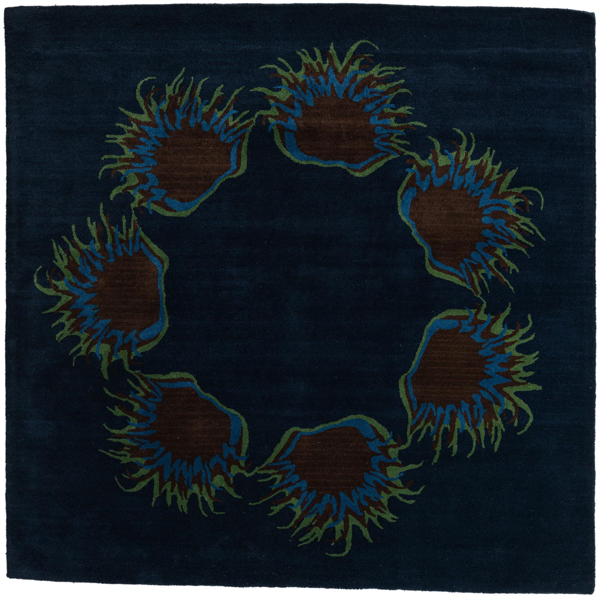 A square navy blue rug with a circular abstract pattern of brown, blue, and green shapes resembling sea anemones.