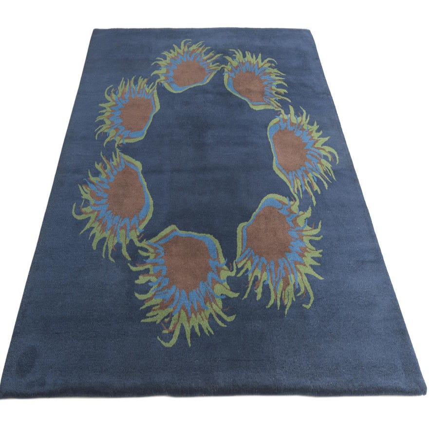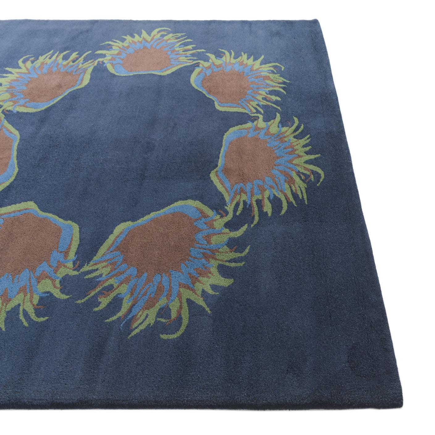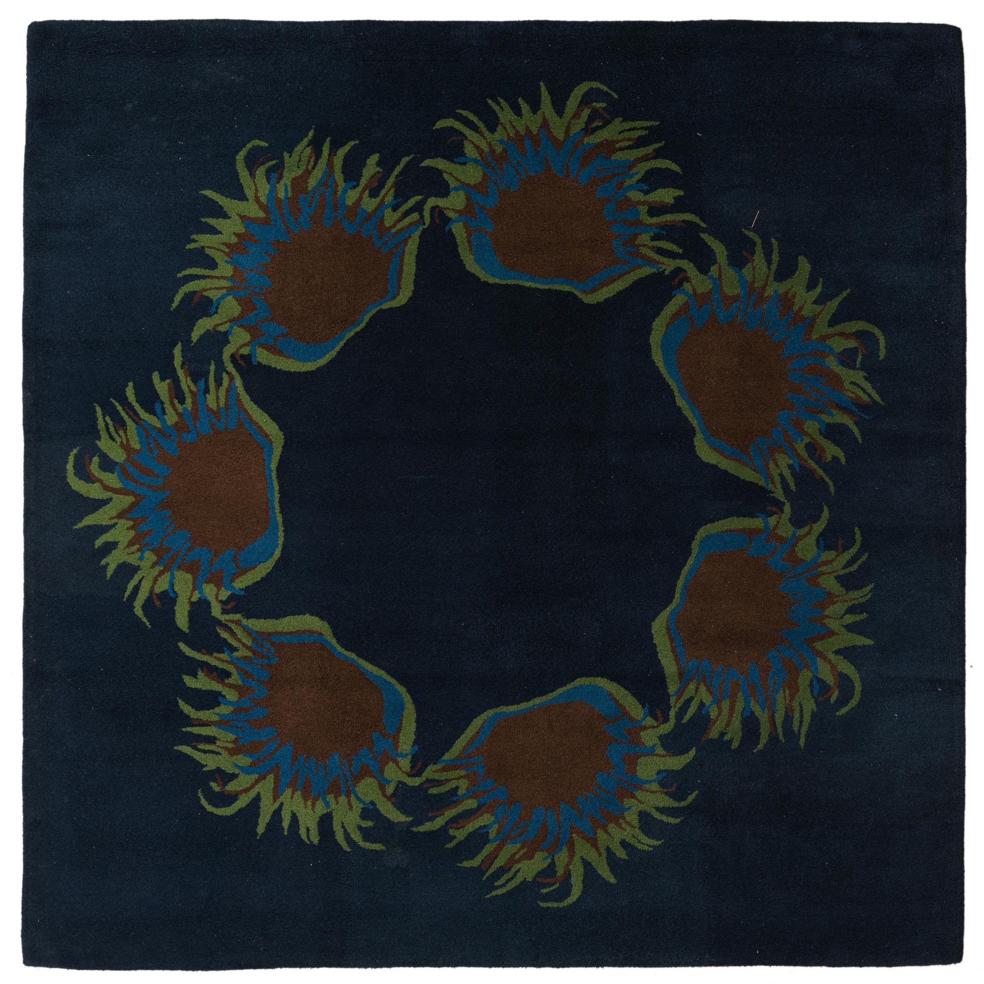 A deep navy field anchors a bold, circular arrangement of organic sunburst motifs in brown, blue and green. Each motif has a solid brown center surrounded by layered blue and green outlines that flare outward like stylized petals or waves, leaving a calm, open center that balances the design. The overall look leans contemporary with an artisanal touch, where the graphic ring gives movement without overwhelming the space.