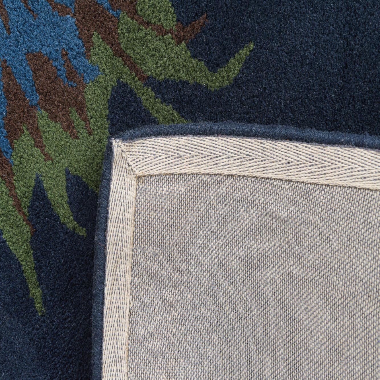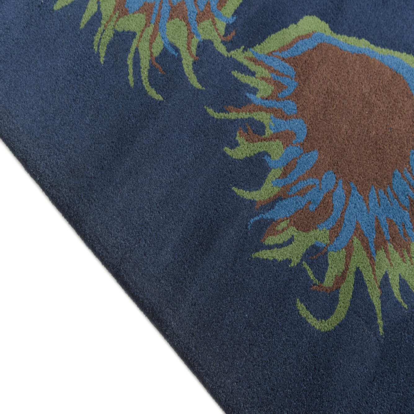 Primary color is Navy Blue. Colors in this rug include: Navy Blue, Blue, Brown, Green.