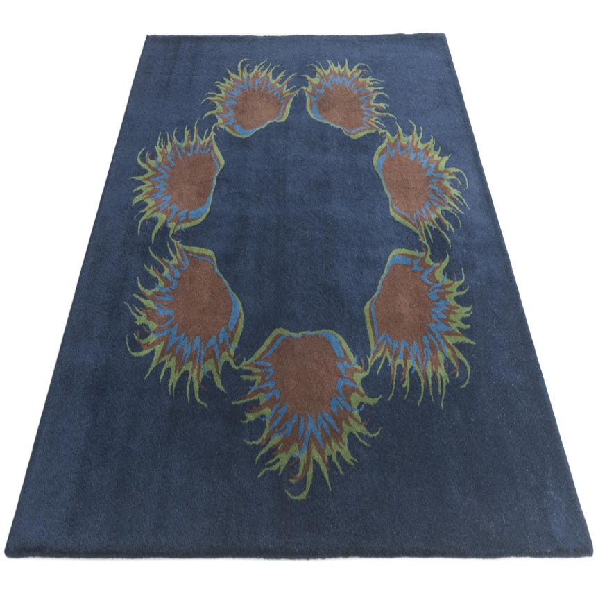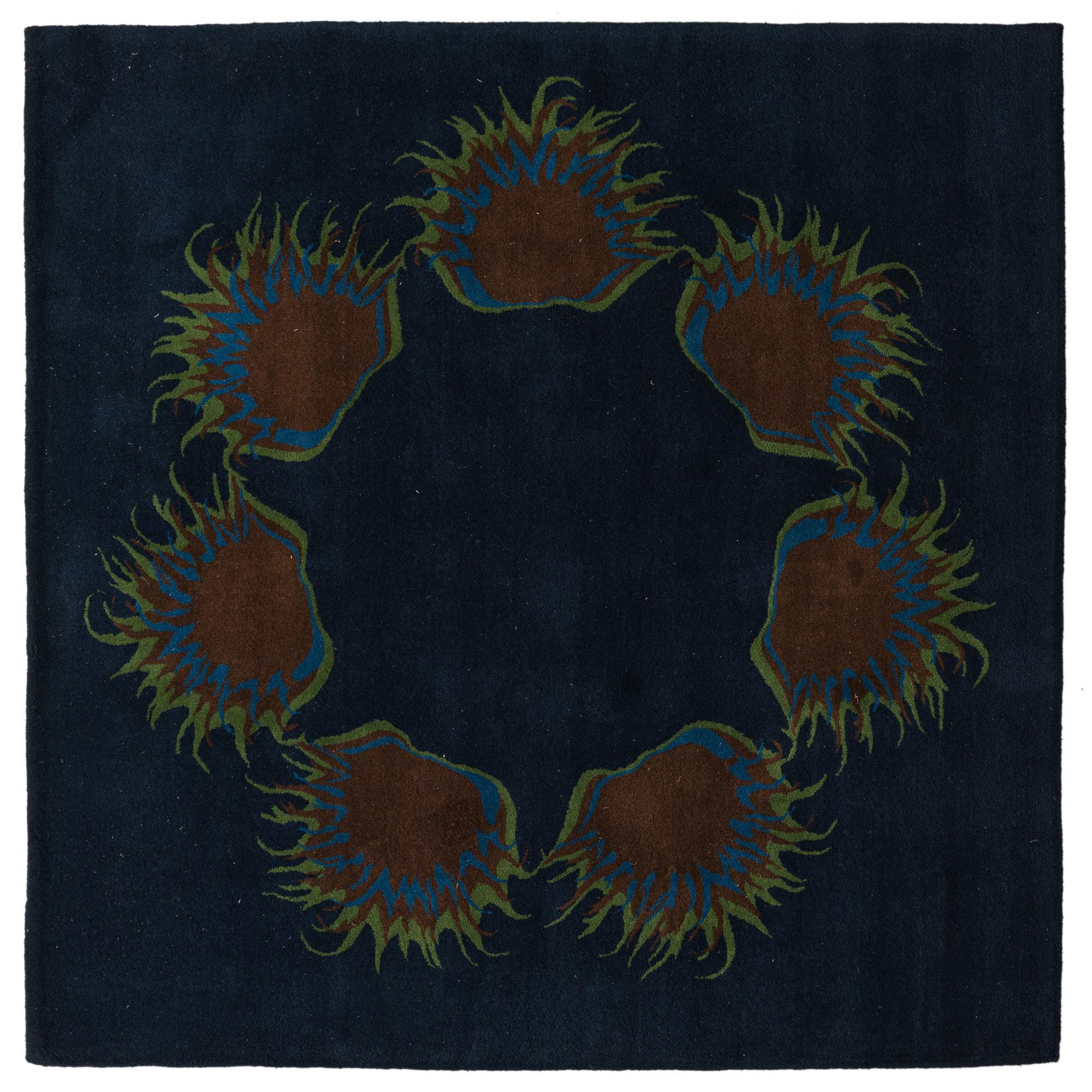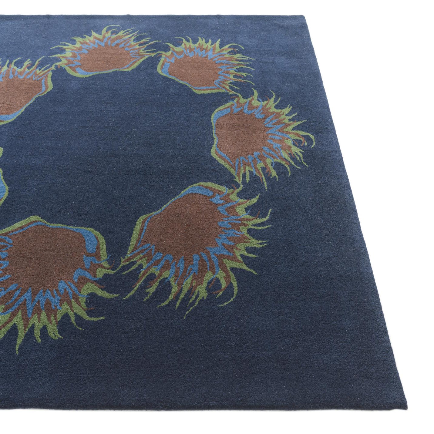 A 7'6" x 7'6" square navy blue wool and cotton rug with a modern circular pattern of brown, blue, and green abstract shapes.