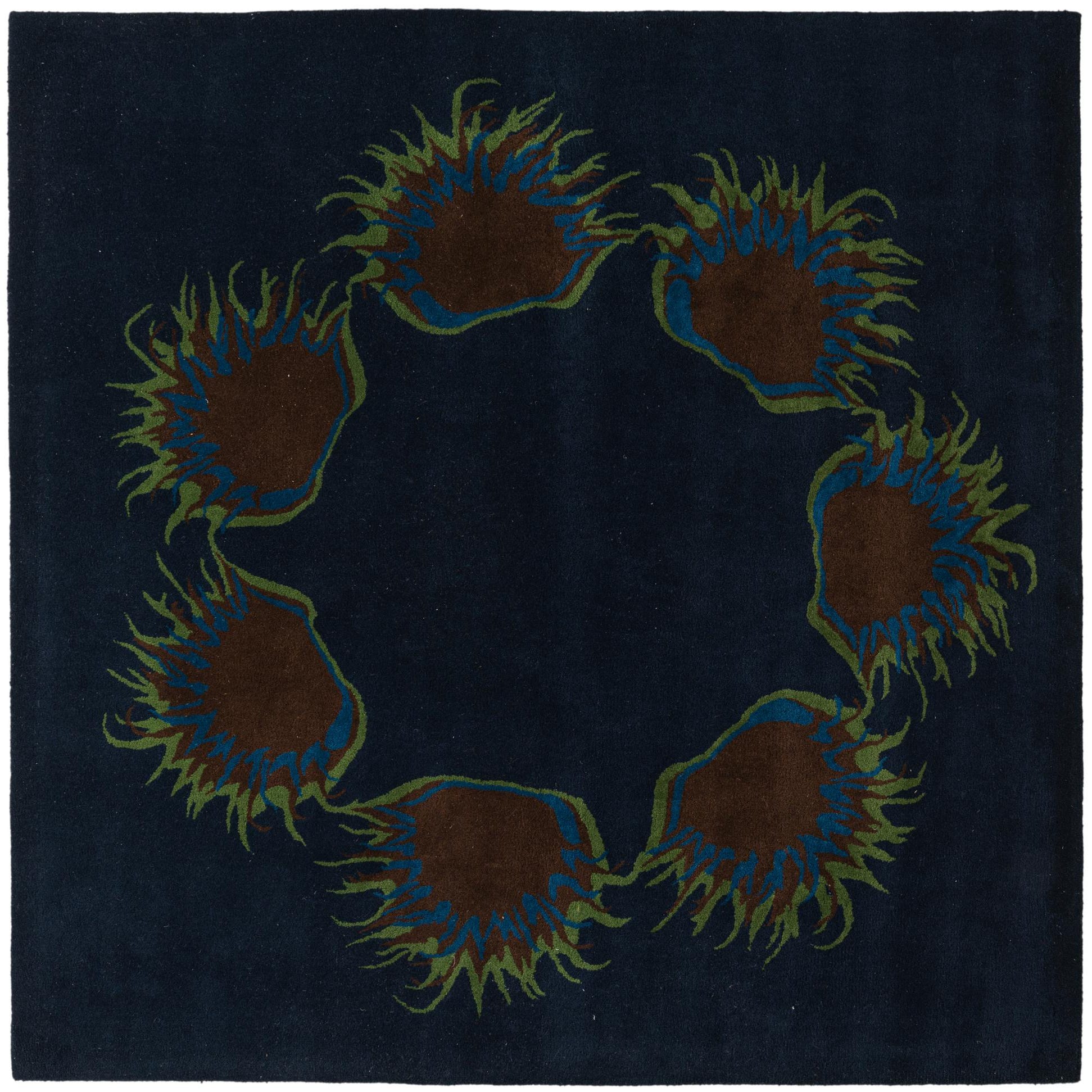 A square navy blue modern wool rug with a circular pattern of abstract brown, blue, and green shapes.