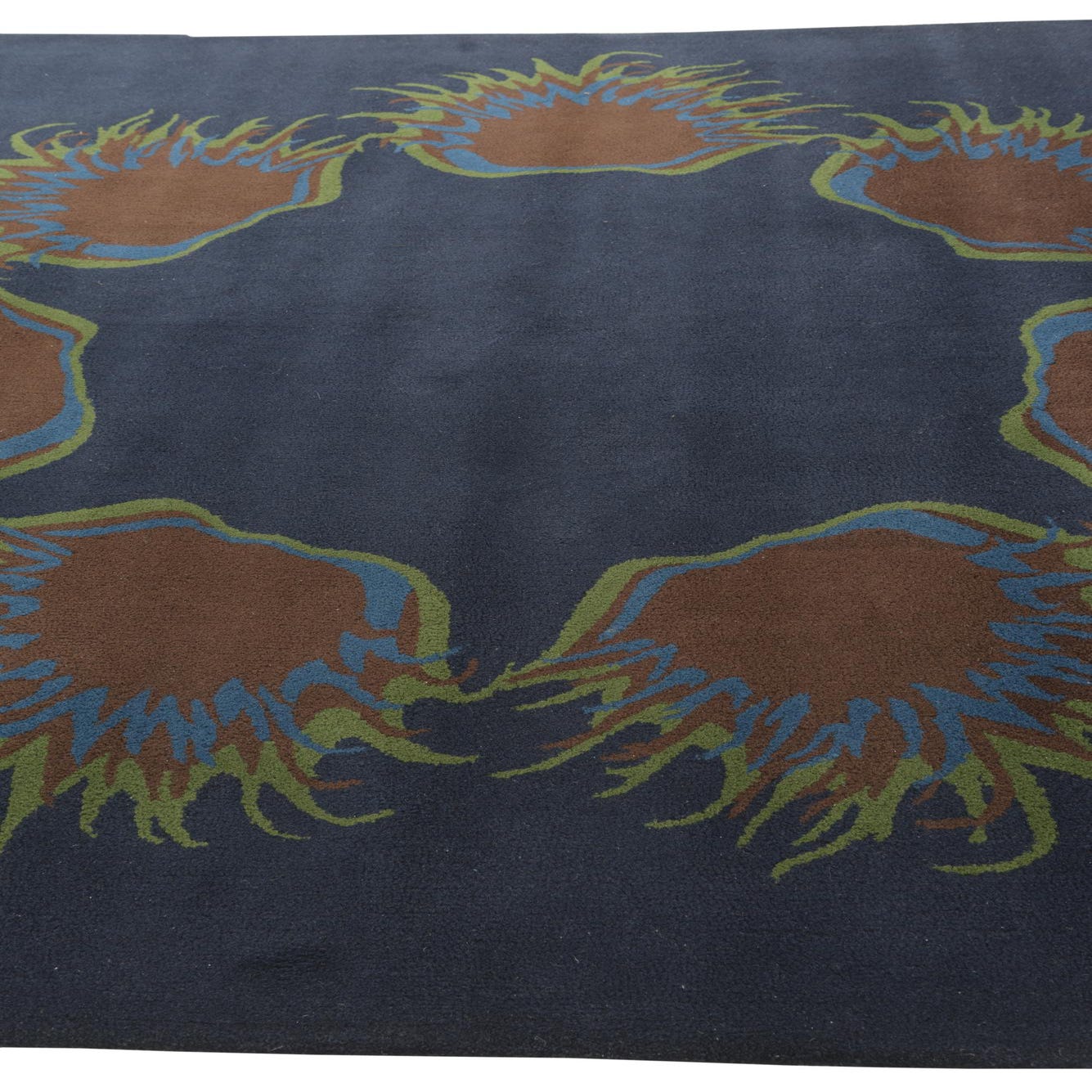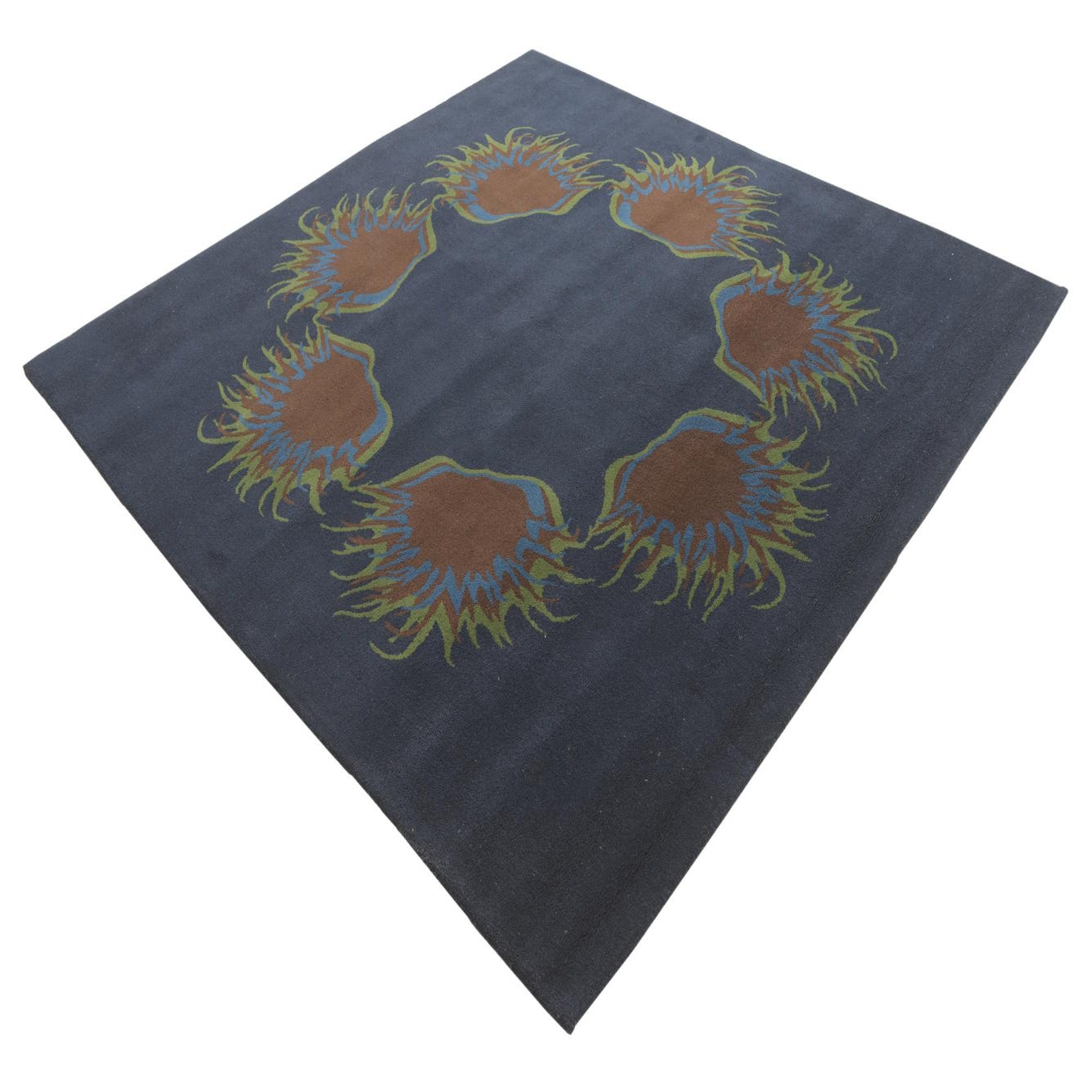 A square navy blue rug with a circular modern pattern of brown, blue, and green abstract shapes resembling sea anemones.