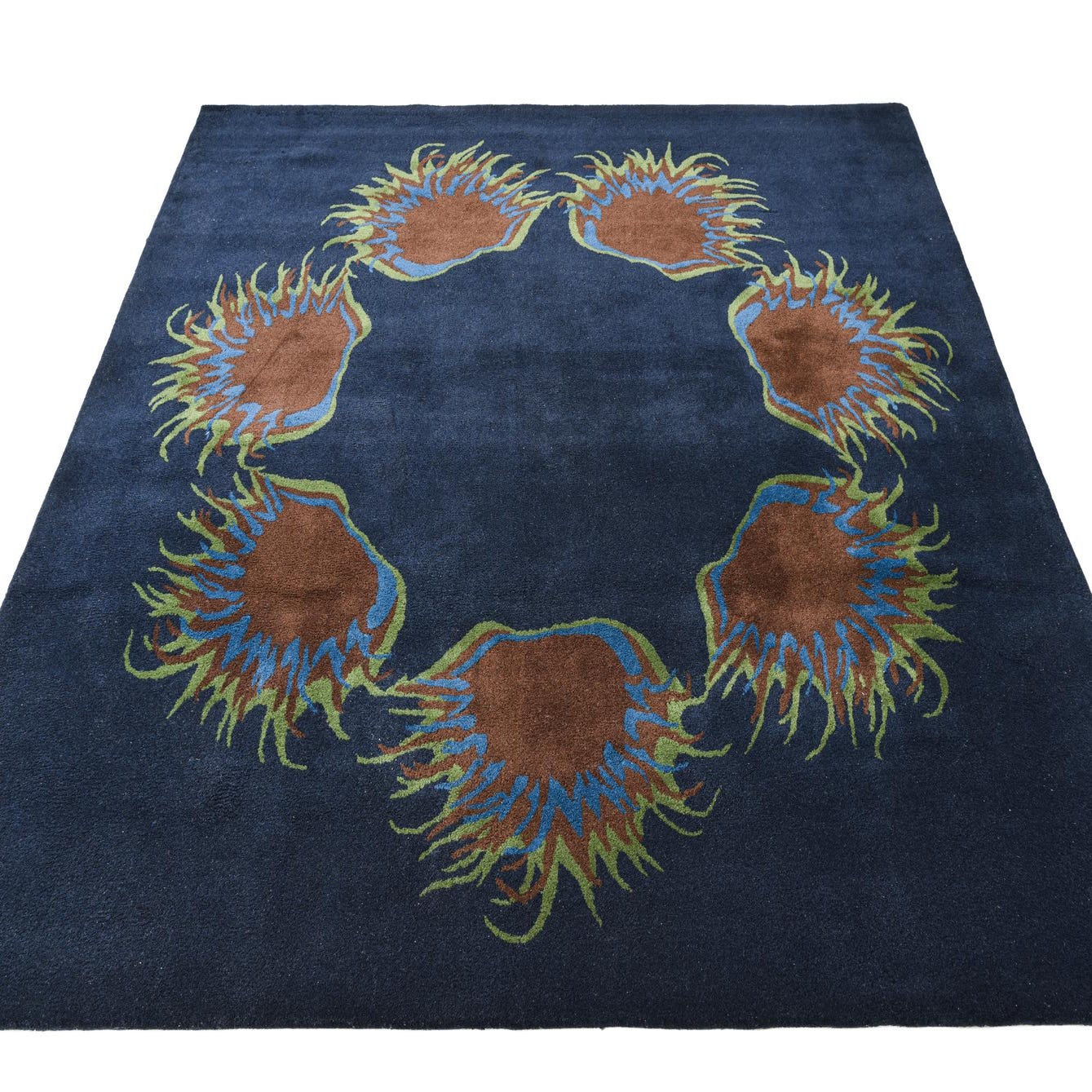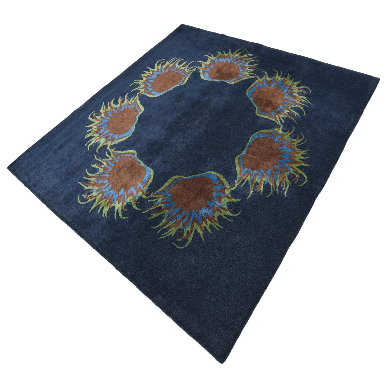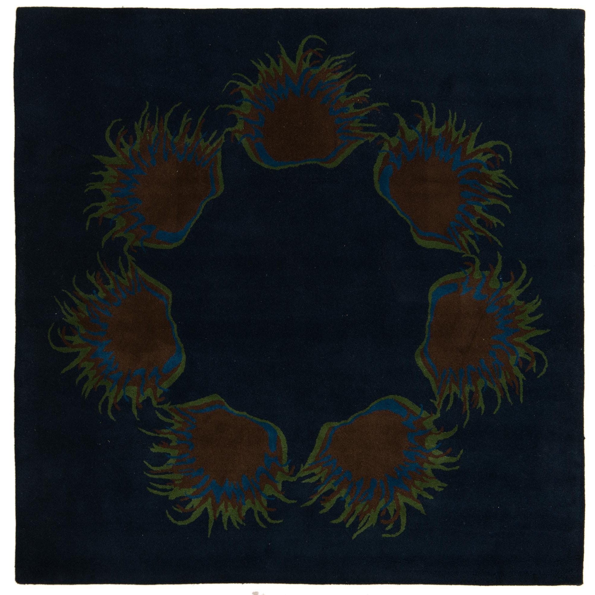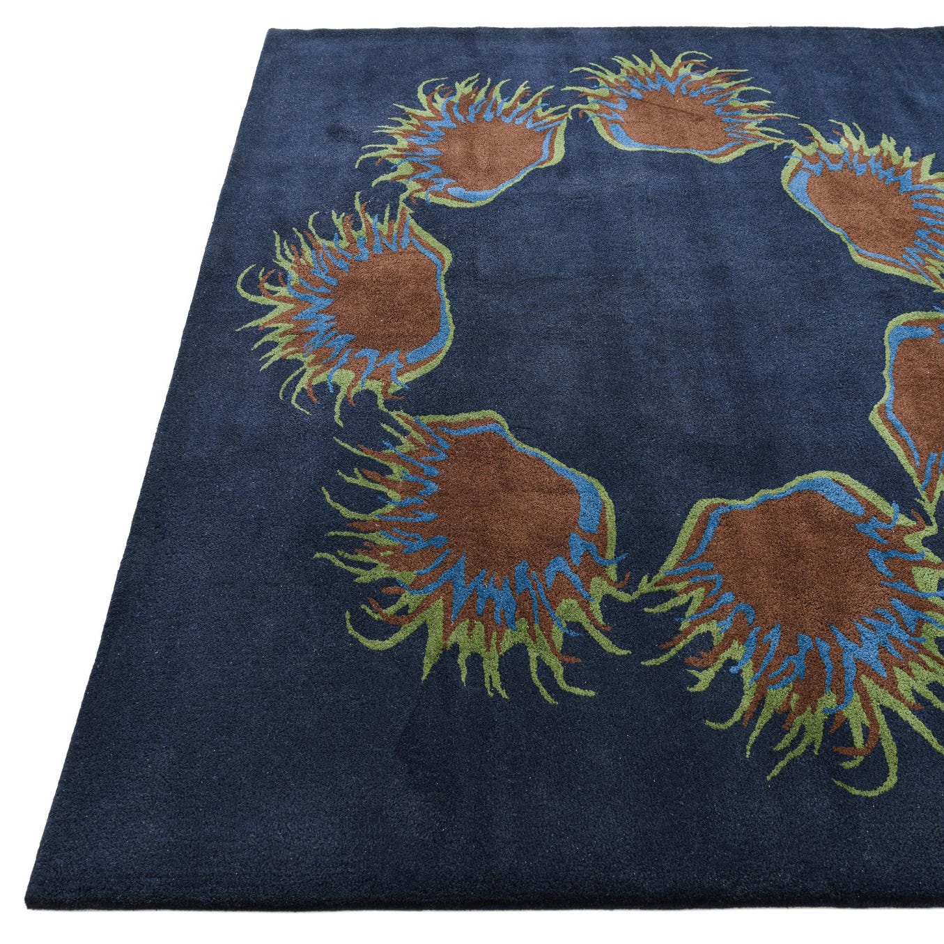 A 7' 7 x 7' 7 square navy blue rug with a modern floral pattern of brown, blue, and green sunburst shapes arranged in a circle.