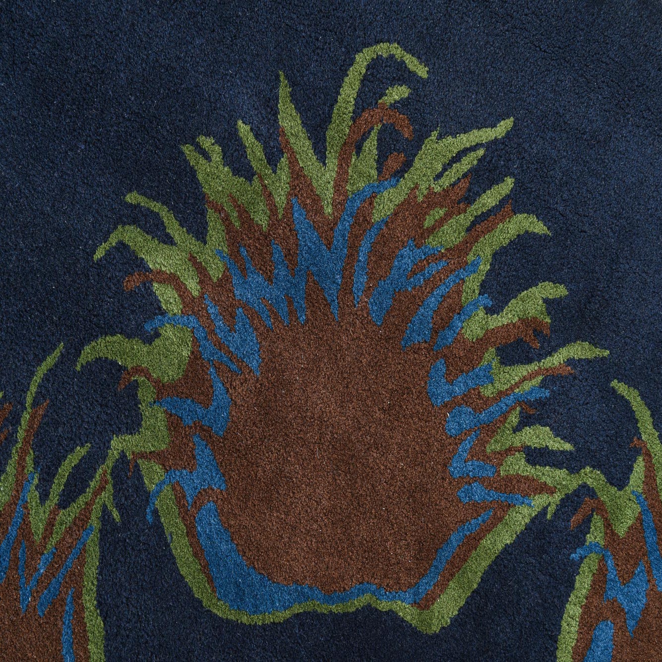 The Luna Collection 8 Ft Square rug presents a bold, artistic statement with its hand-tufted craftsmanship of wool and cotton. Dominated by a deep navy blue background, the design features expressive, organic shapes outlined in a palette of green, brown, and additional shades of blue. These elements combine to create an abstract, floral-inspired motif that is both contemporary and reminiscent of plush botanical forms.