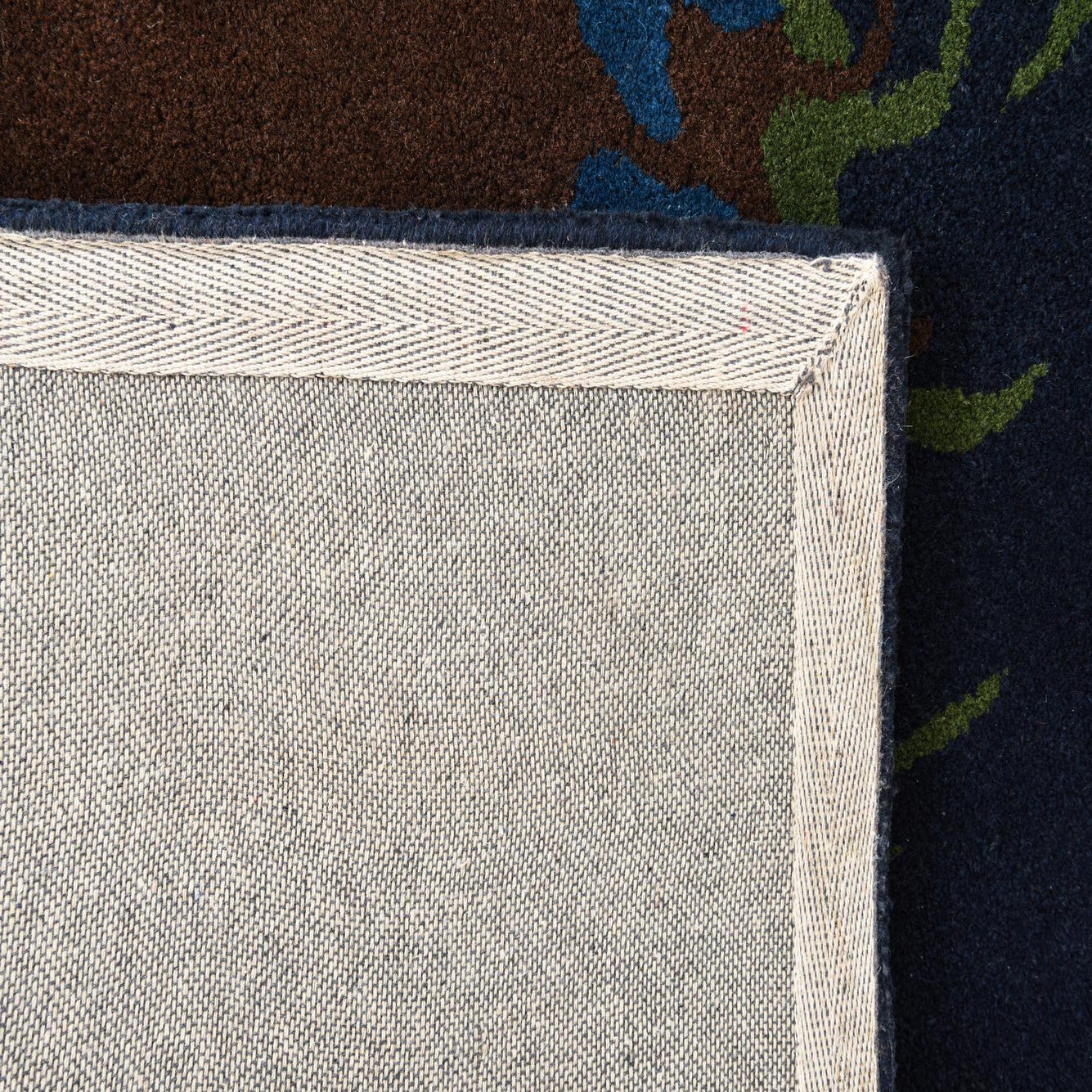 Primary color is Navy Blue. Colors in this rug include: Navy Blue, Green, Brown, Blue.