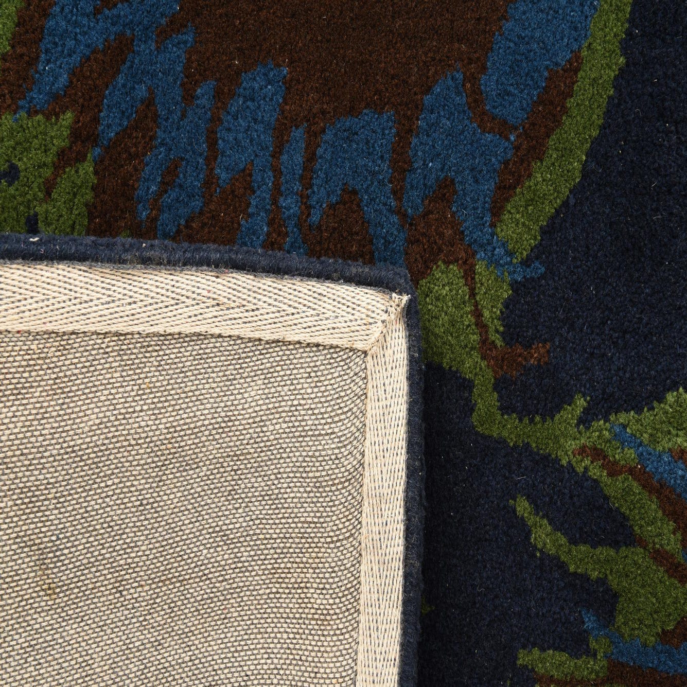Primary color is Navy Blue. Colors in this rug include: Navy Blue, Blue, Brown, Green.