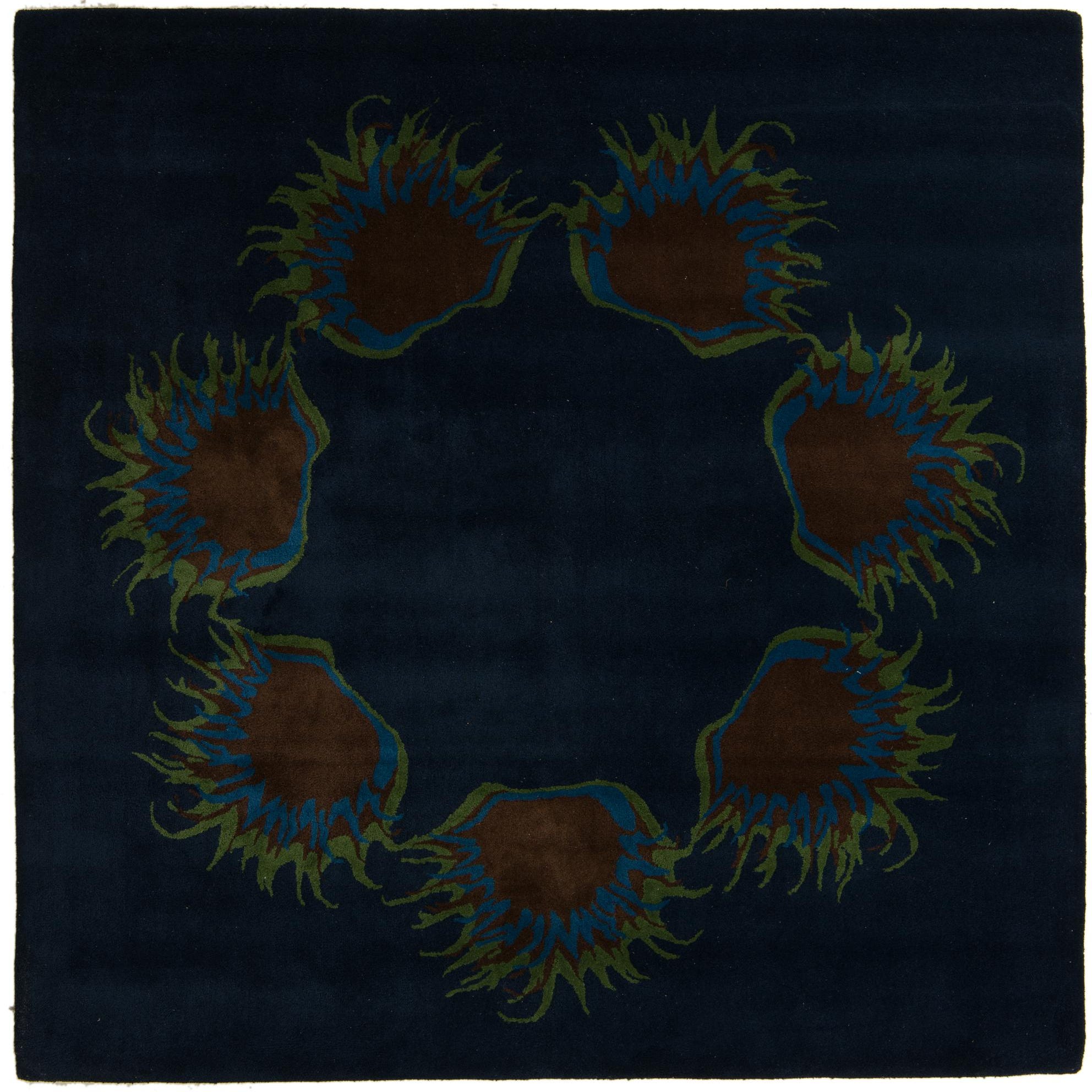 A square navy blue modern rug featuring a circular arrangement of abstract floral motifs in brown, blue, and green.