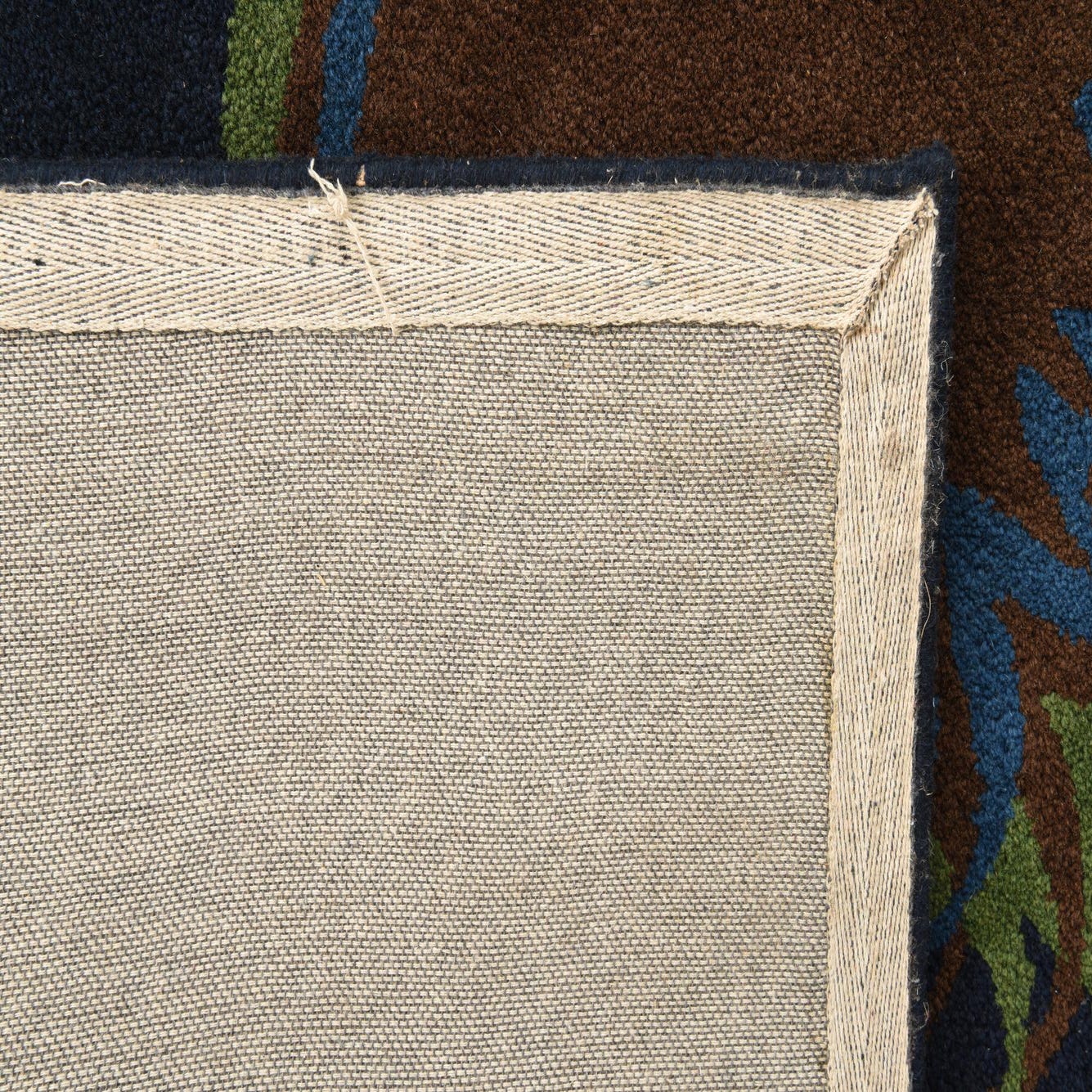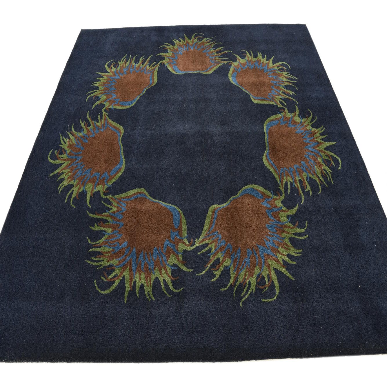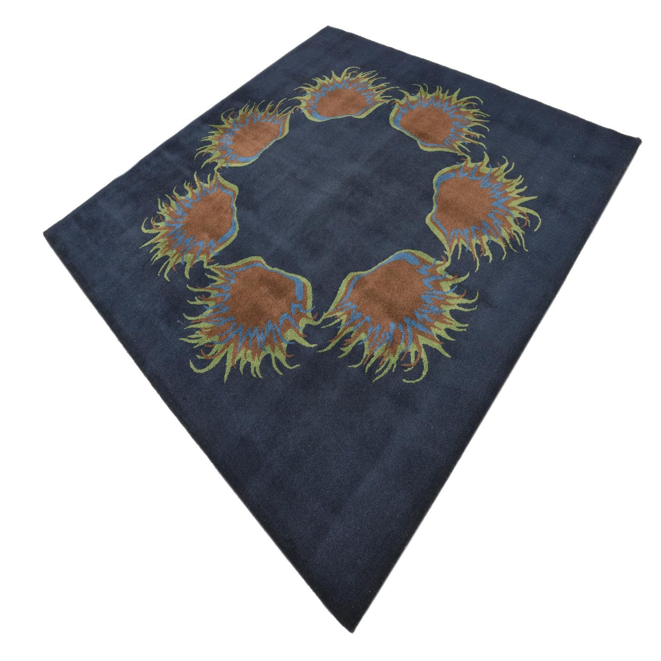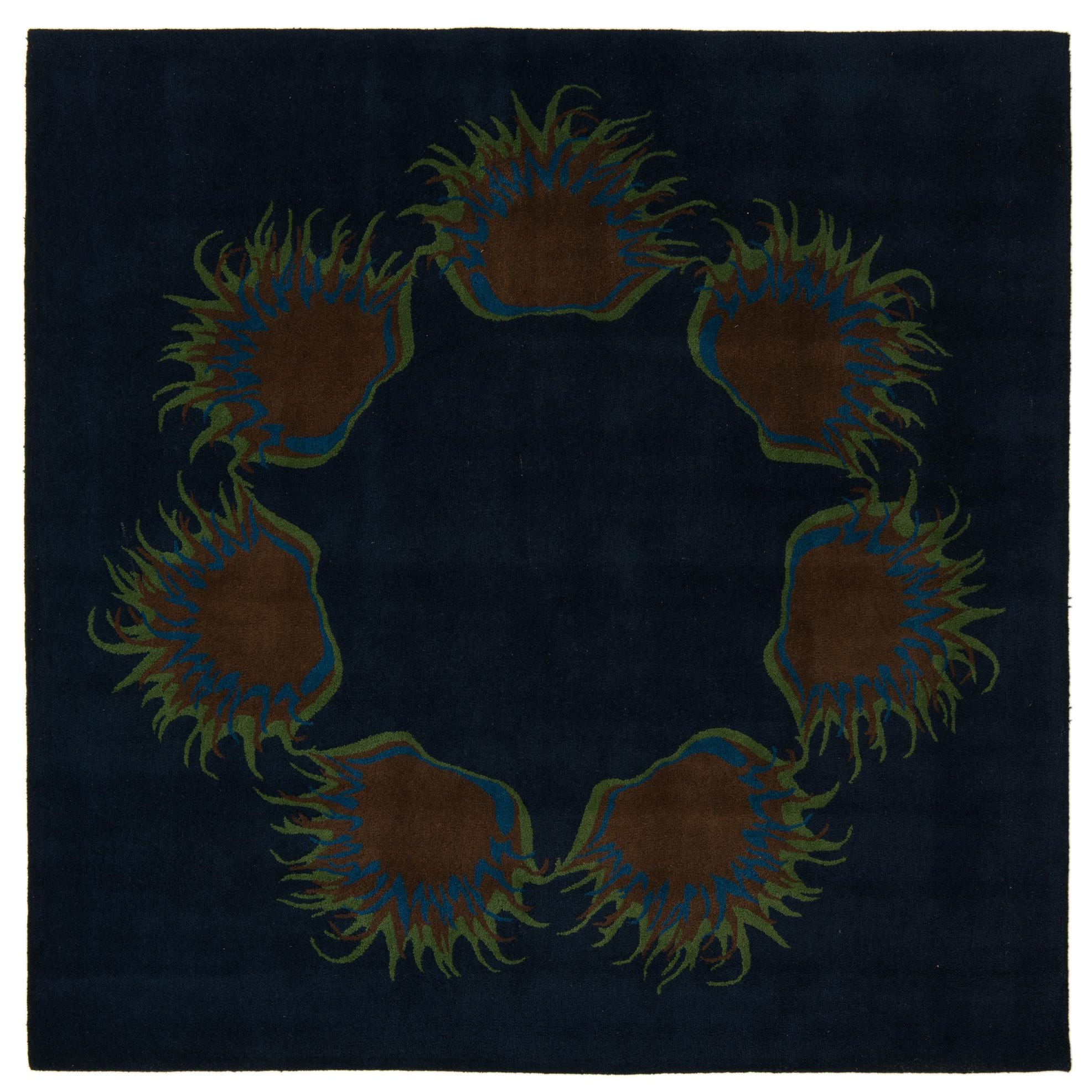 A square navy blue rug with a central circular floral pattern in brown, green, and blue, featuring a high pile.