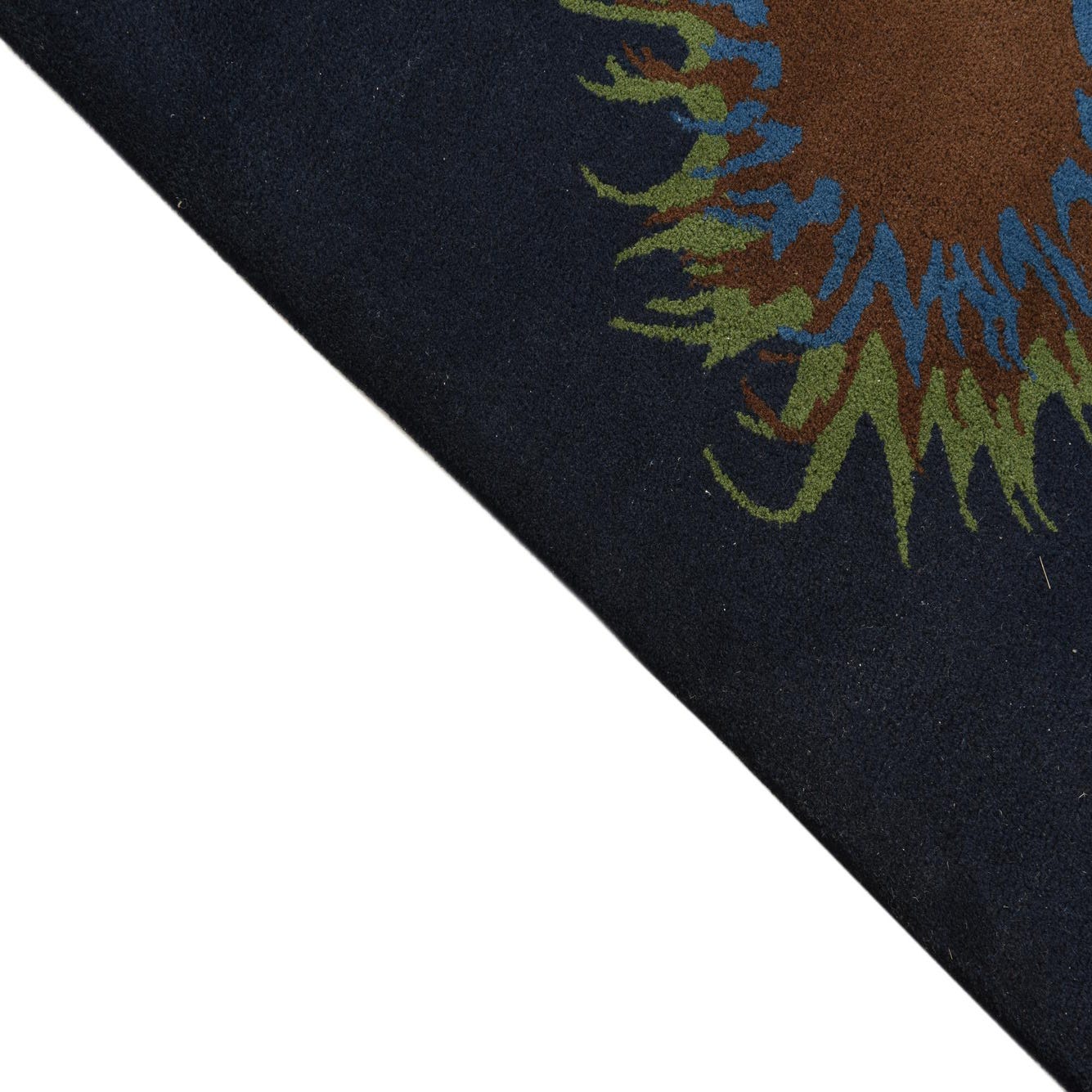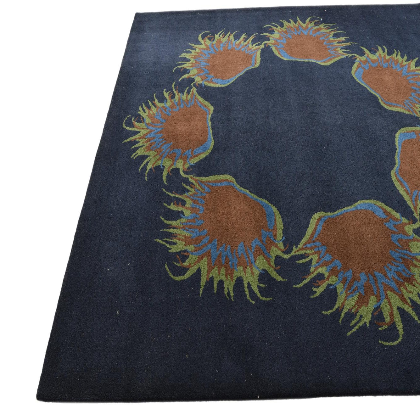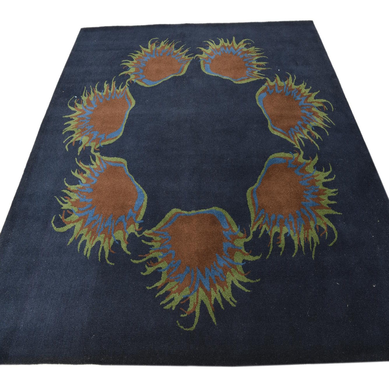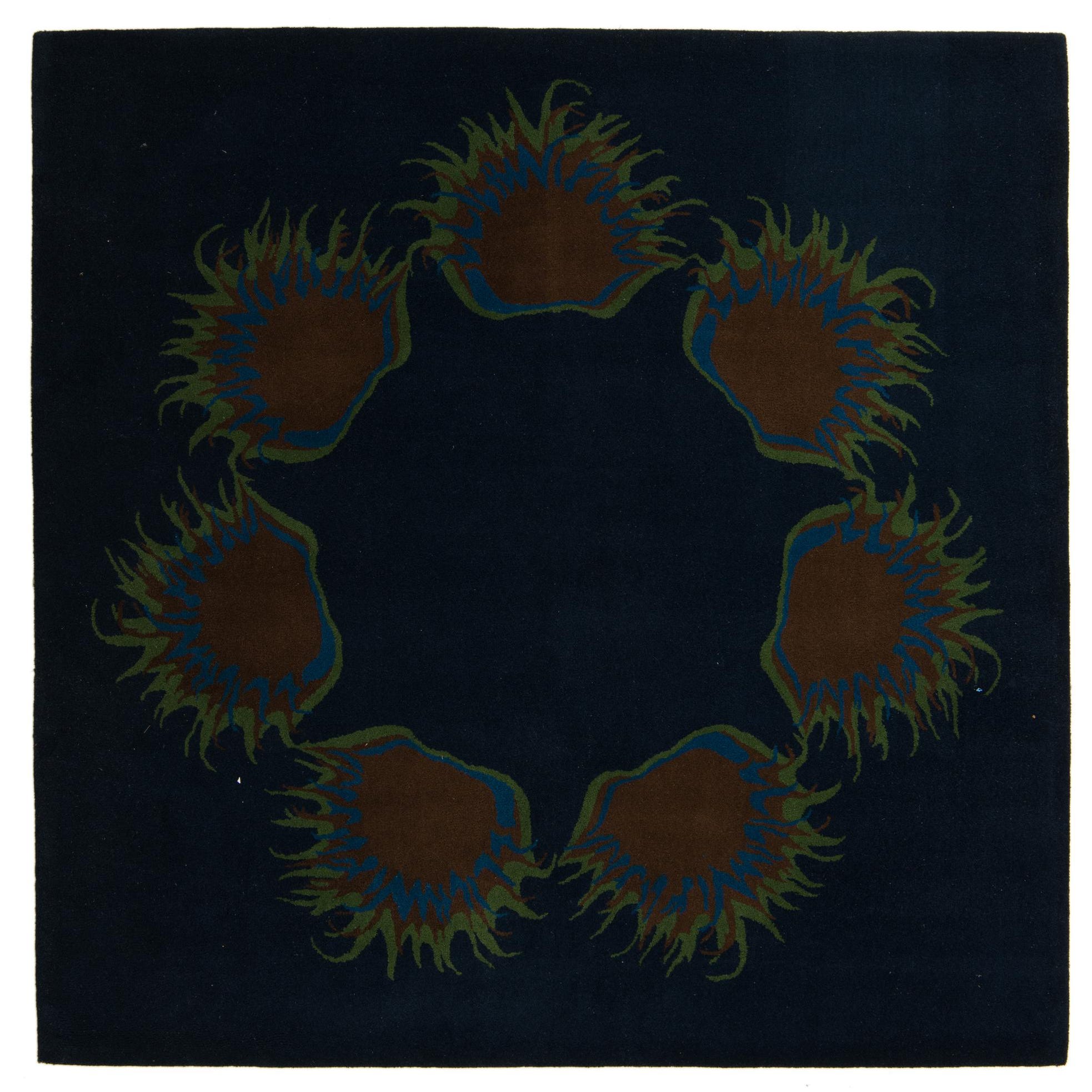 A square navy blue Luna rug with a modern floral pattern of six brown, blue, and green sun-like shapes forming a circle.