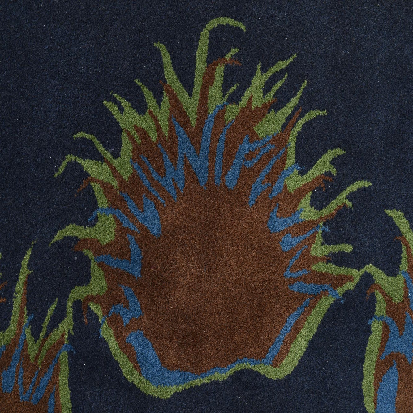 A deep navy field sets a calm, grounding stage for a circular wreath of organic motifs that float toward the rug’s edges. Each motif has a rich brown center surrounded by energetic, flame-like strokes in blue and green that create motion without overwhelming the design. Hand-tufted of wool with a cotton foundation, the surface feels soft and dense underfoot; the wool pile holds crisp color transitions while the hand-tufted construction gives a subtle, tactile presence to the pattern.