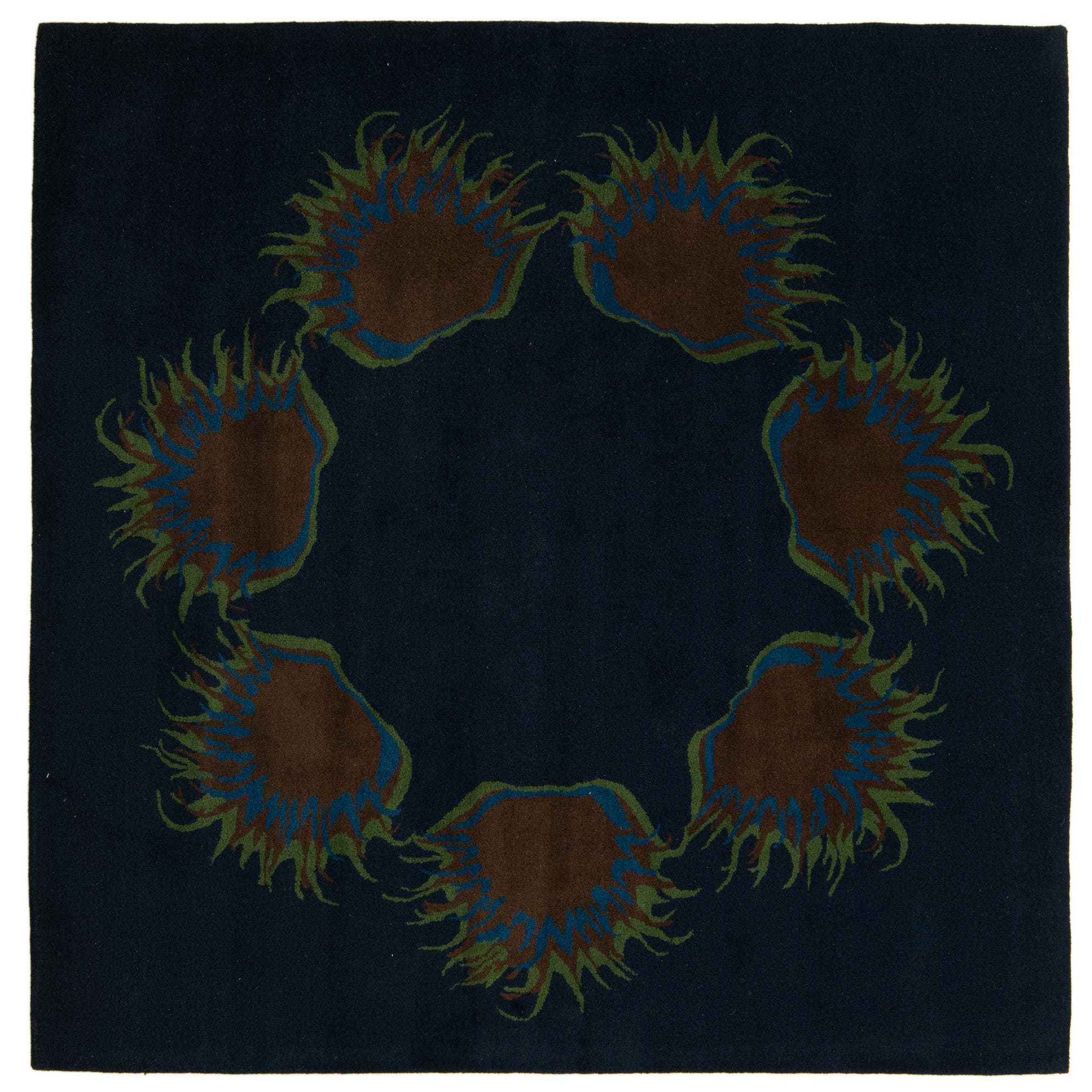 A 7' 7 x 7' 7 square navy blue rug with a modern floral pattern of brown, blue, and green abstract shapes arranged in a circle.