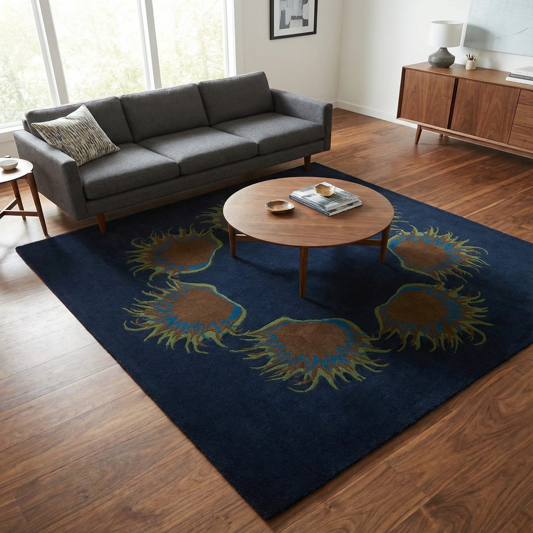 The Luna Collection presents an elegantly crafted 8 Ft Square rug, hand-tufted from a premium blend of wool and cotton. The piece hosts a Navy Blue background, complemented by a distinctive pattern featuring organic motifs in shades of Blue, Brown, and Green. The design suggests movement and natural harmony, creating a captivating focal point for any room.