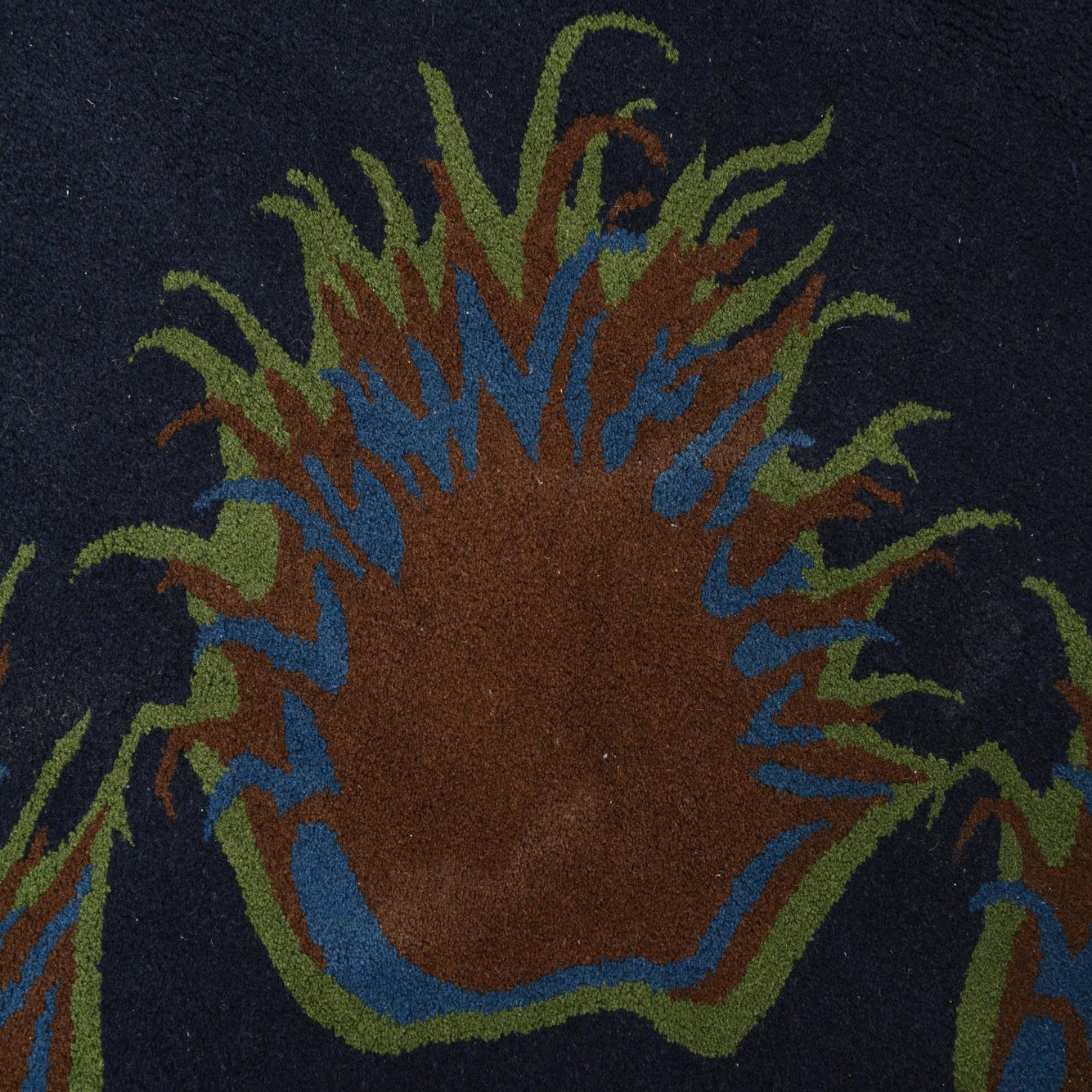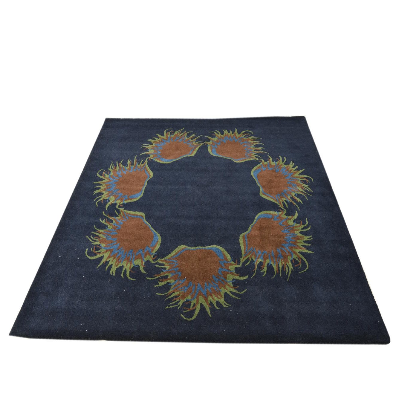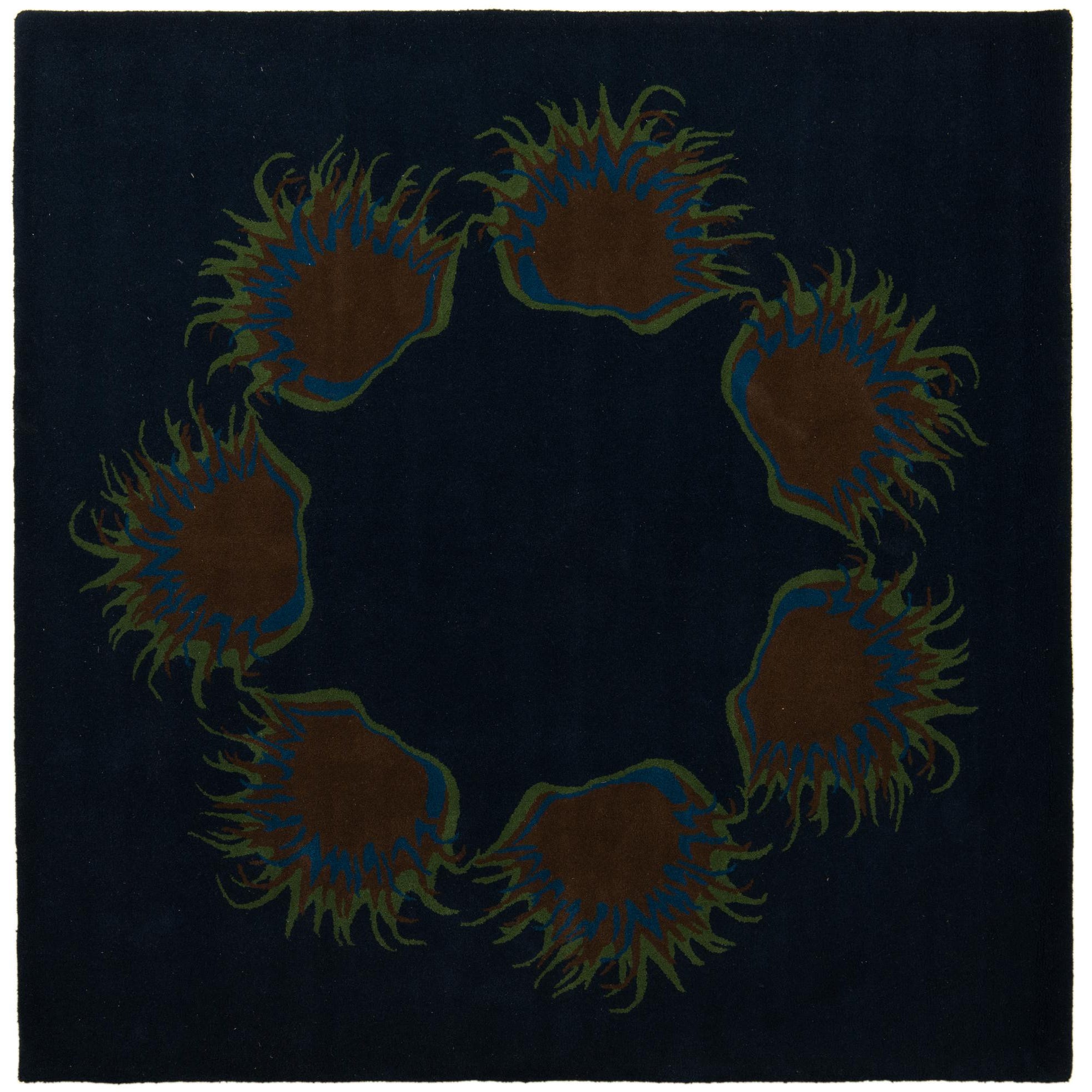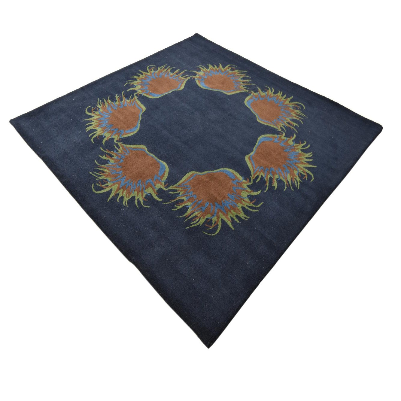 A square navy blue wool and cotton rug with a high pile, featuring a modern floral design of brown, green, and blue abstract shapes arranged in a circle.