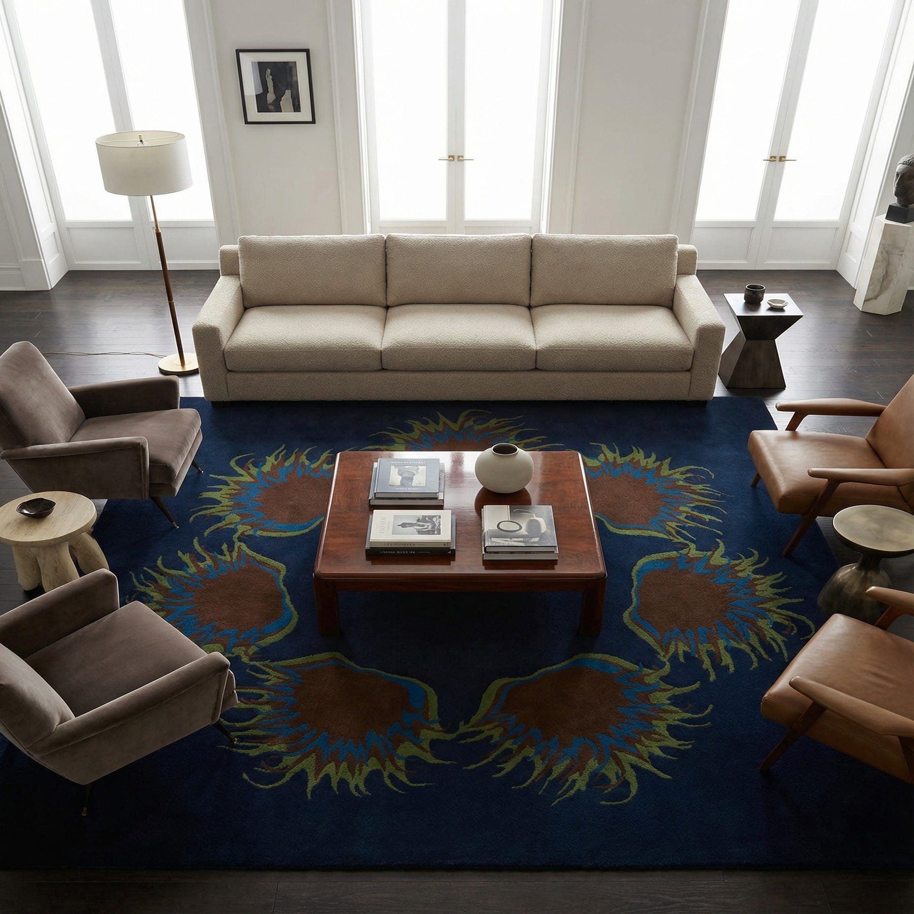 The Luna Collection introduces this hand tufted piece crafted from a harmonious blend of wool and cotton, offering both durability and soft texture. This 8-foot square rug commands attention with its striking pattern, featuring abstract organic shapes that are outlined in a vibrant blue, embellished with hints of brown and green, all set against a deep navy blue background.