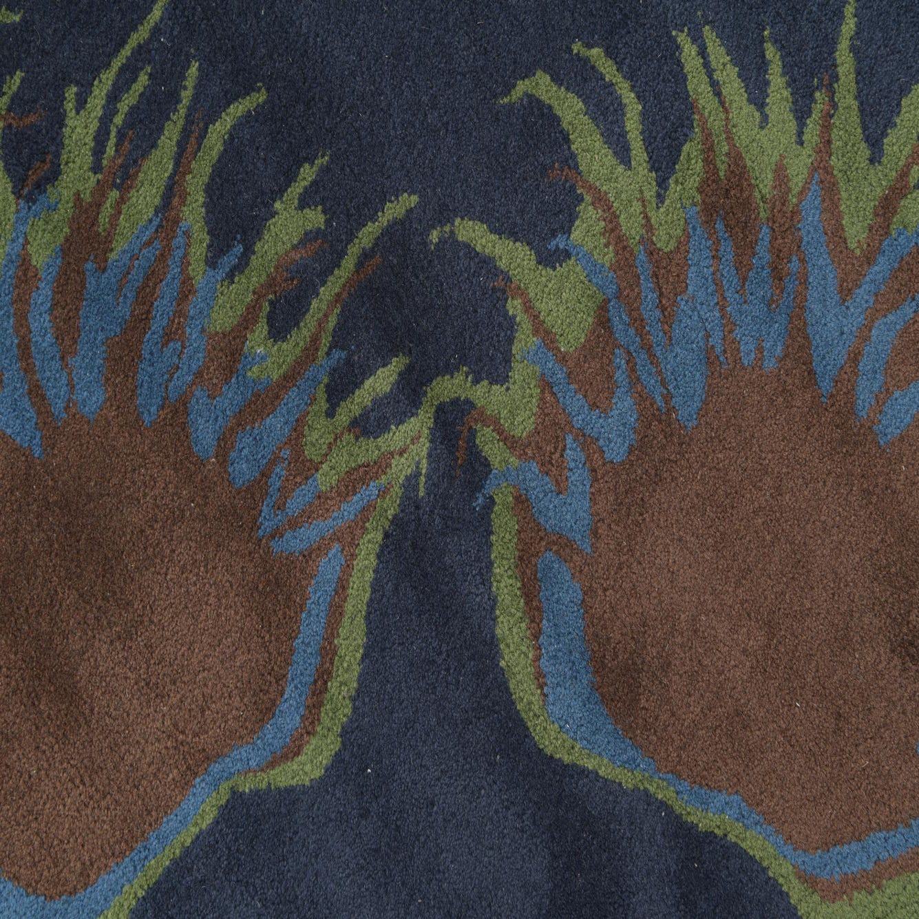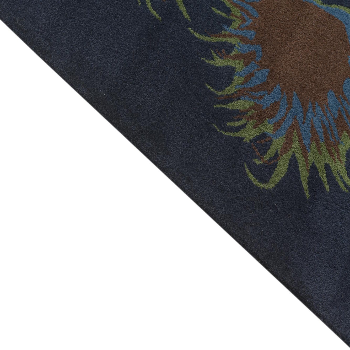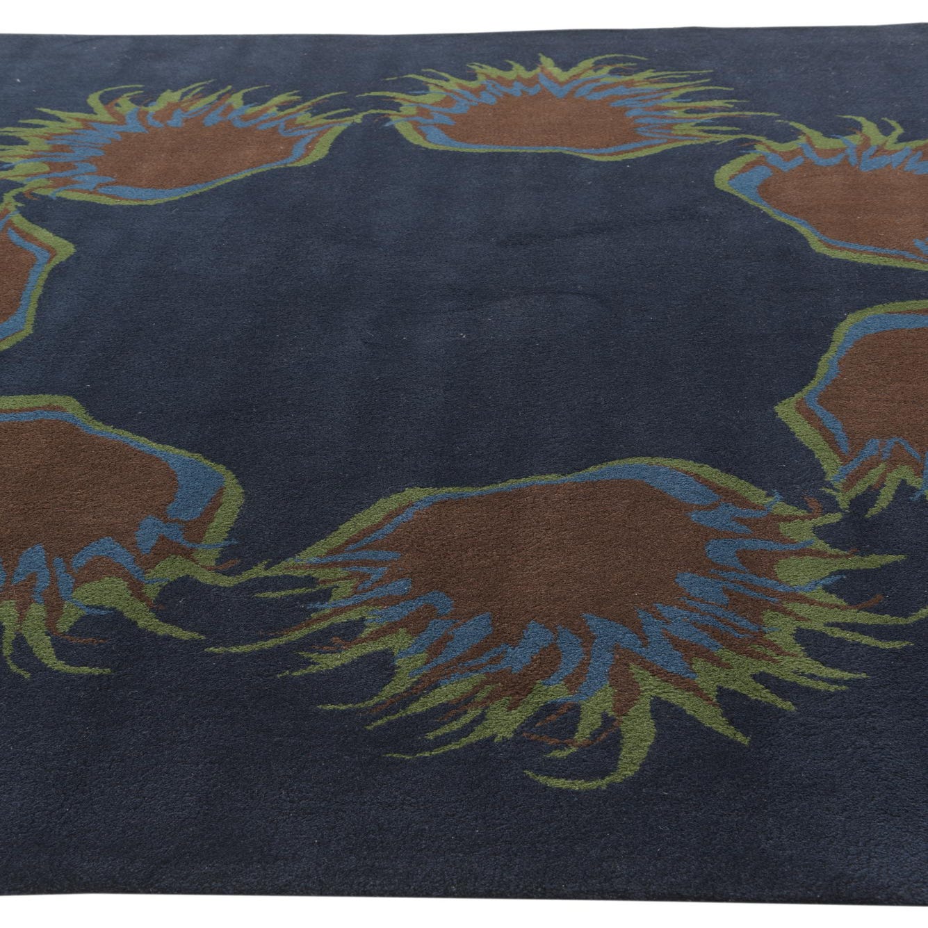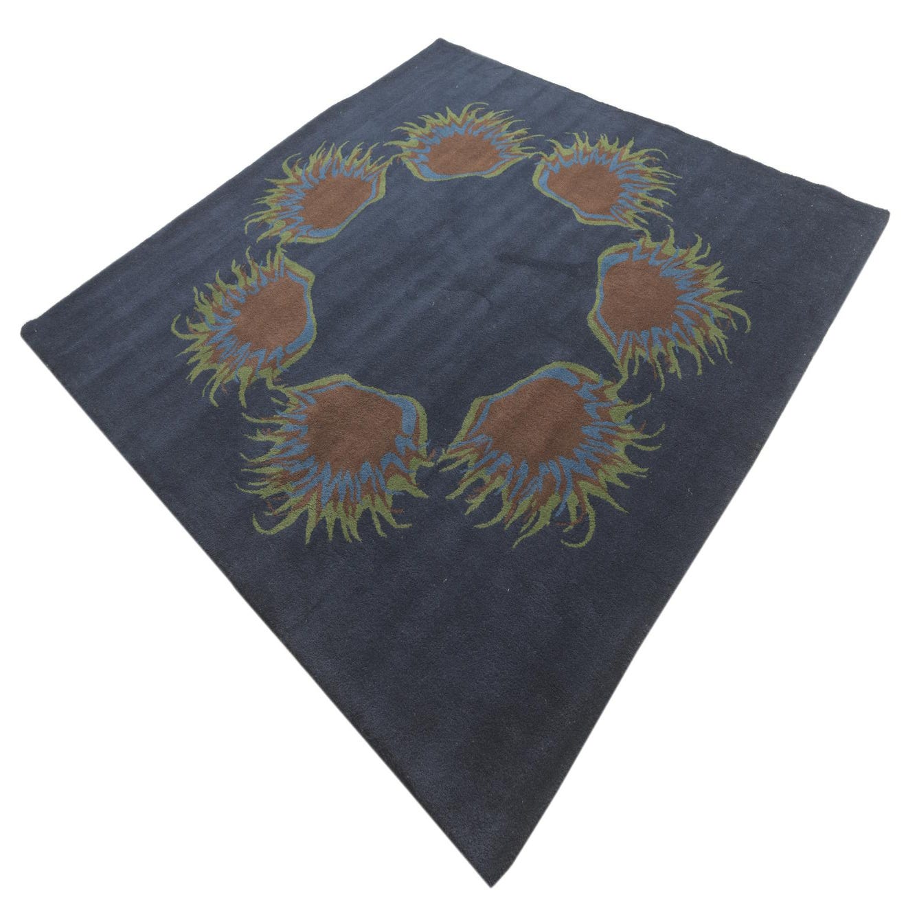 A square navy blue rug with a circular floral pattern of brown, blue, and green spiky shapes.