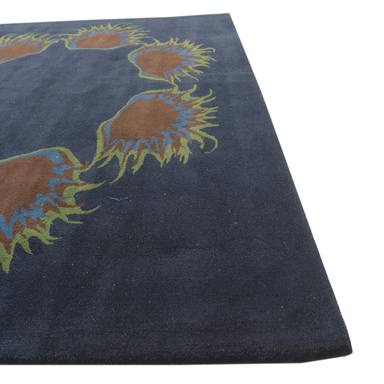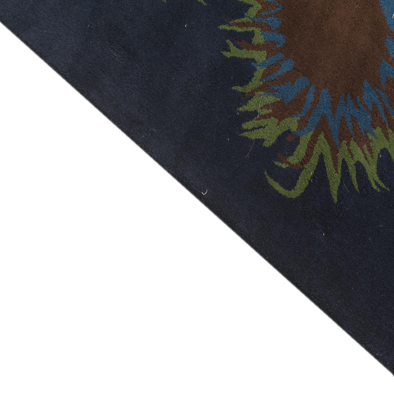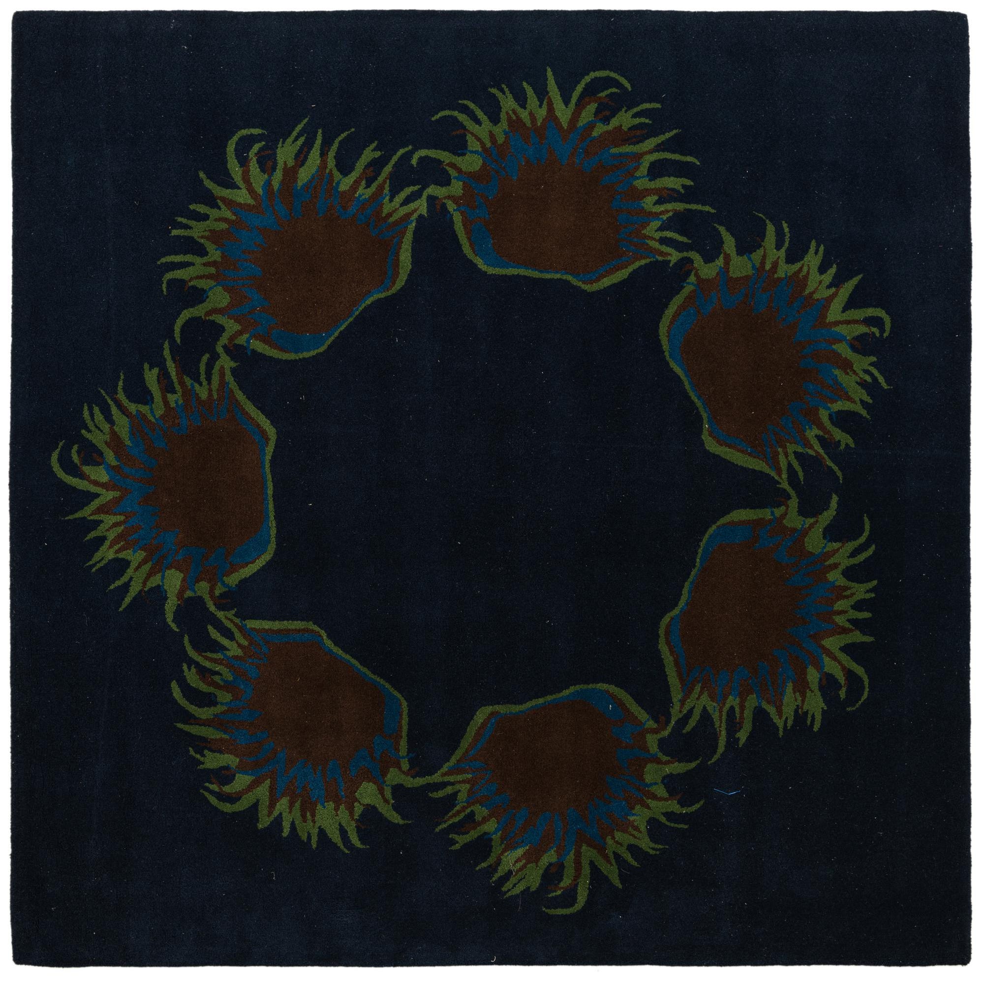 A square navy blue wool and cotton rug with a circular floral pattern of brown, green, and blue petals.