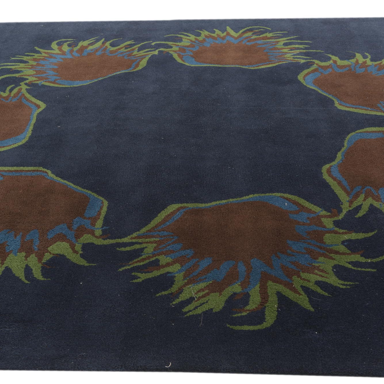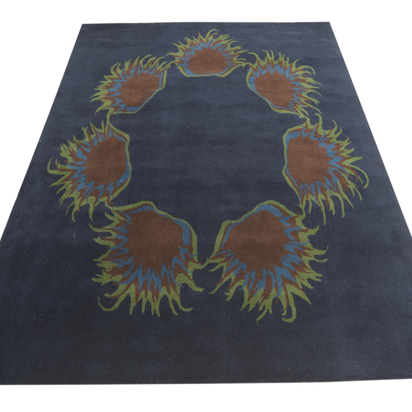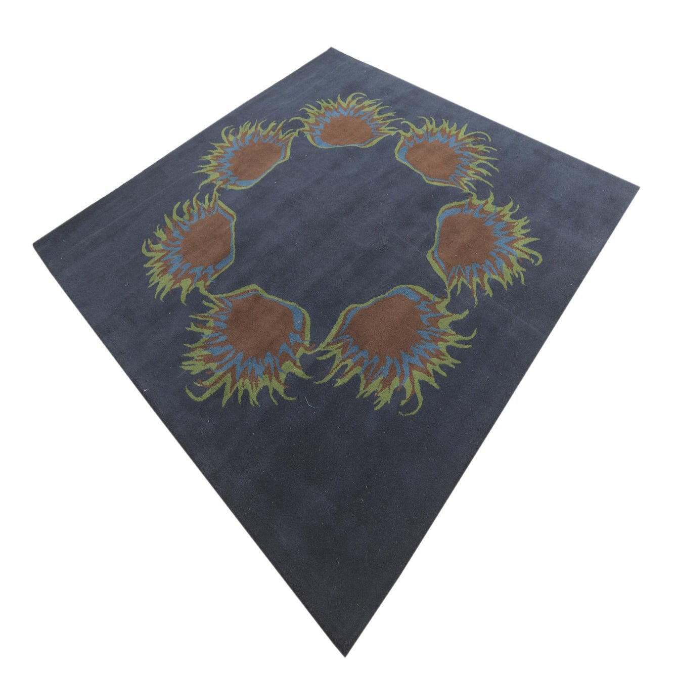 A square navy blue wool and cotton rug with a circular floral pattern of brown, green, and blue petals.